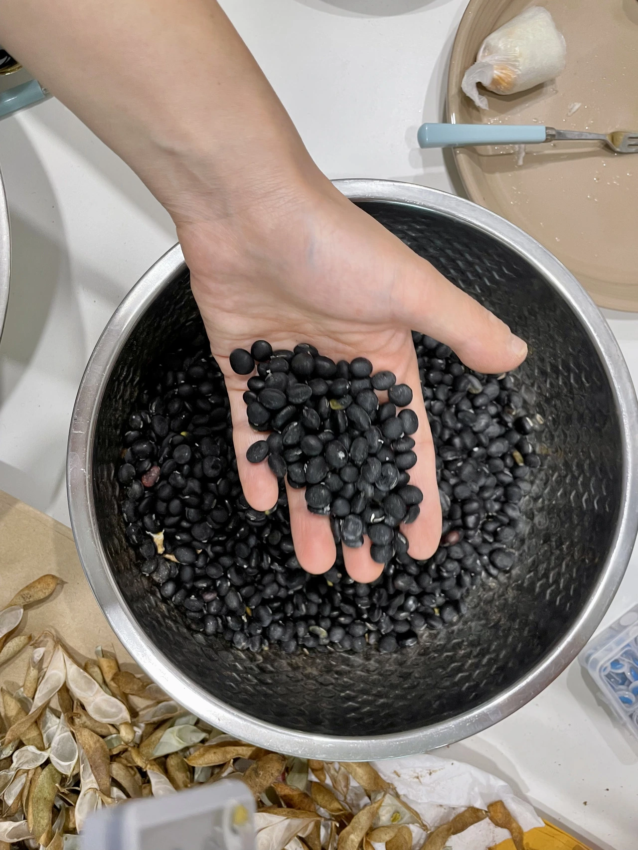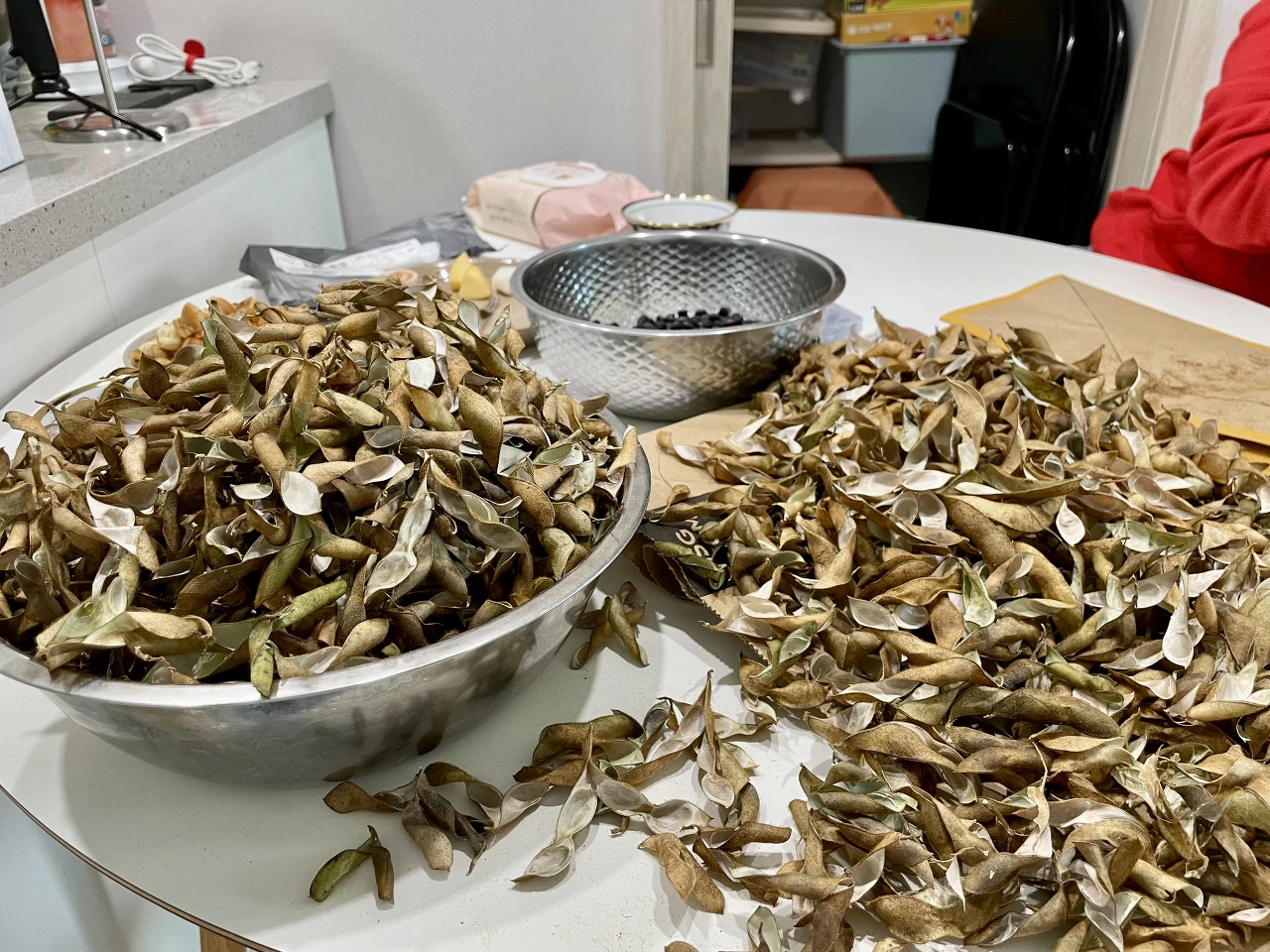 1차 작업을 마치고, 콩깍지 가득 채운 봉지를 들고 친한 이웃집에 차 한 잔 하러 갔습니다. 분명히 먼지가 한 바가지 날릴게 분명한데도, 흔쾌히 콩깍지를 가지고 간다는 저는 반겨주는 제 이웃도 참 괜찮은 분임이 틀림없죠? 약 3시간을 쉬지 않고 노동요를 벗 삼아 콩깍지만 깐 결과 그래도 적지 않은 서리태 콩을 수확할 수 있게 되었습니다. 이 정도 양의 서리태 콩을 그냥 텃밭에 버릴뻔했다니, 지금 생각해도 아까울 뻔했네요.