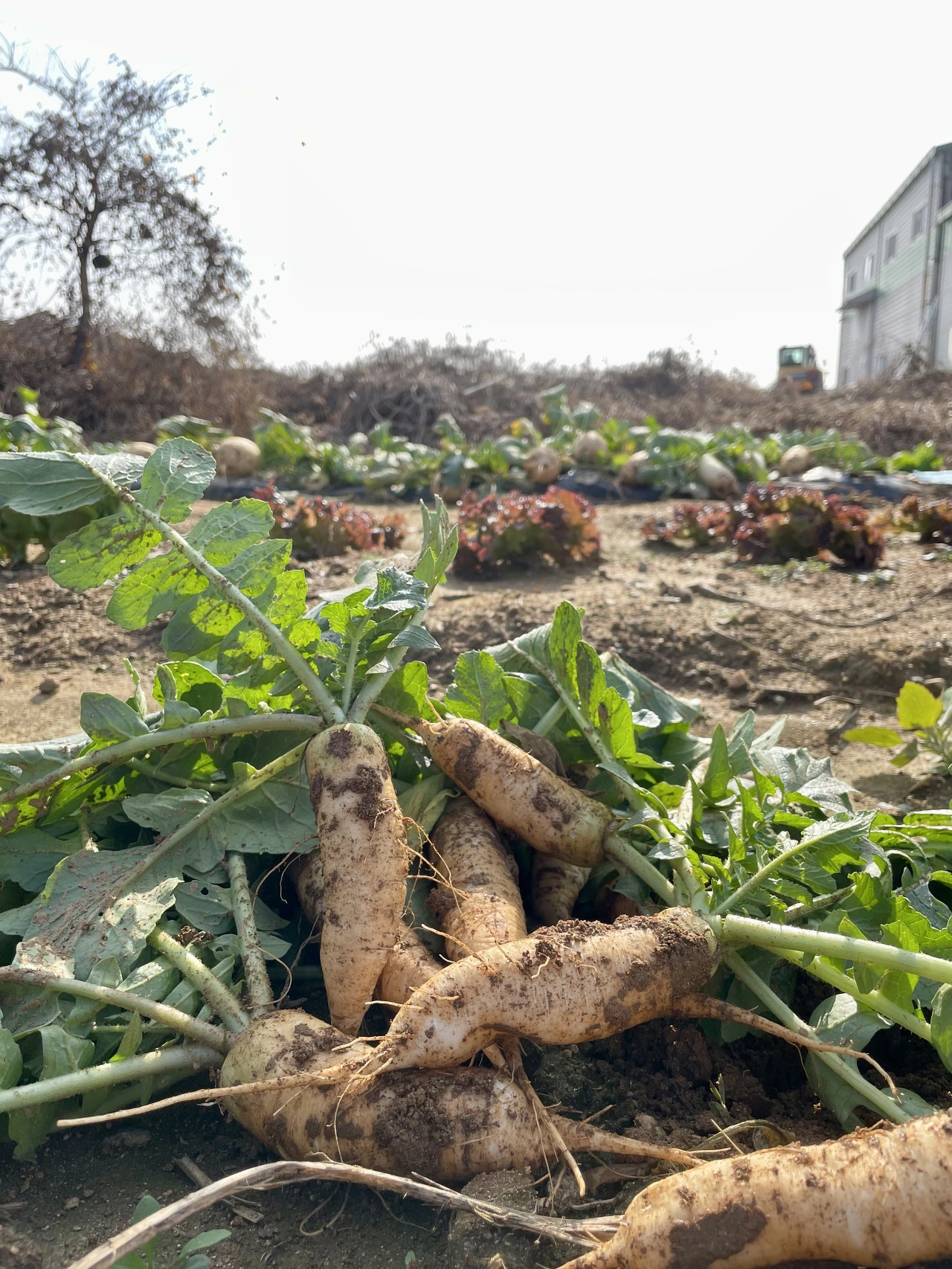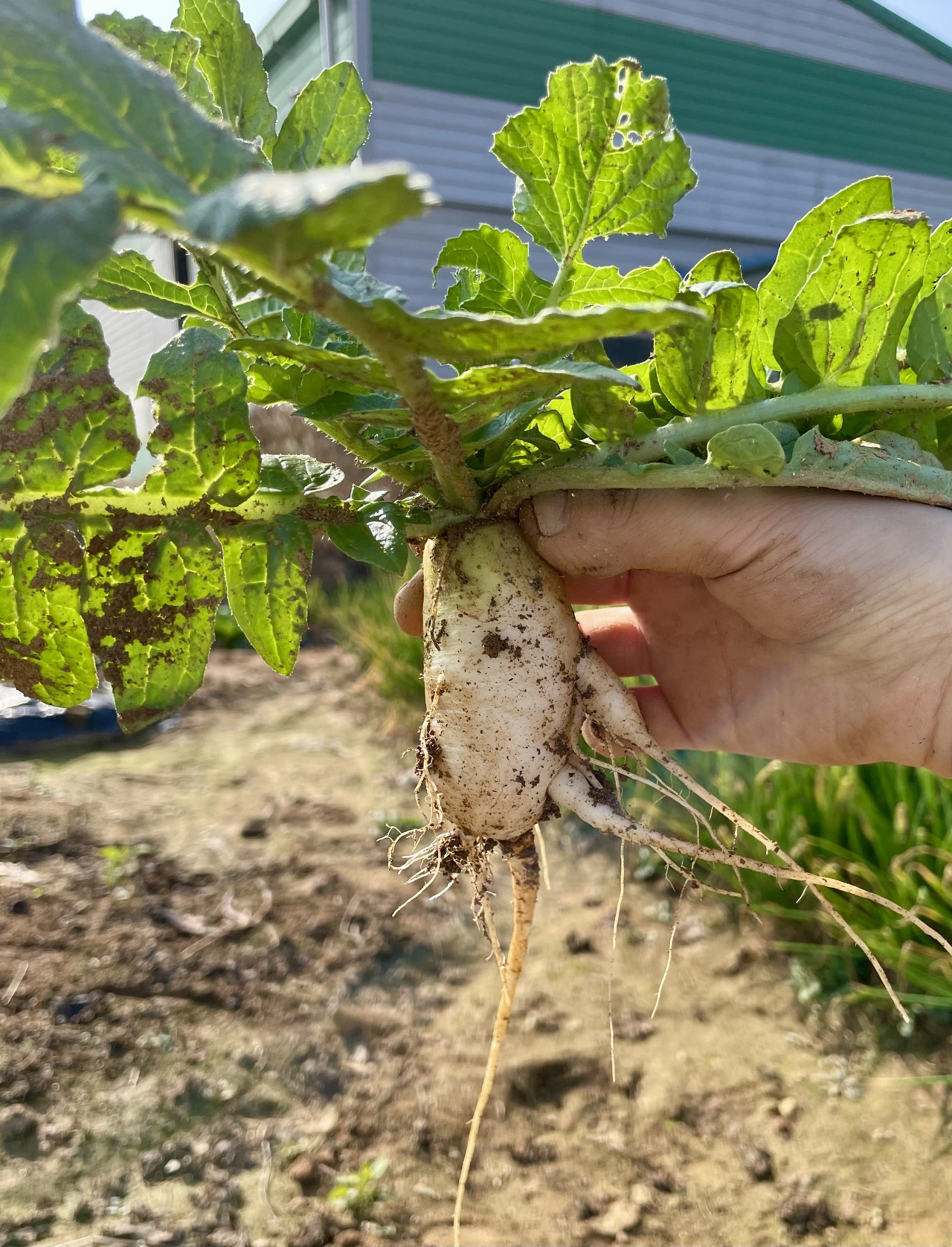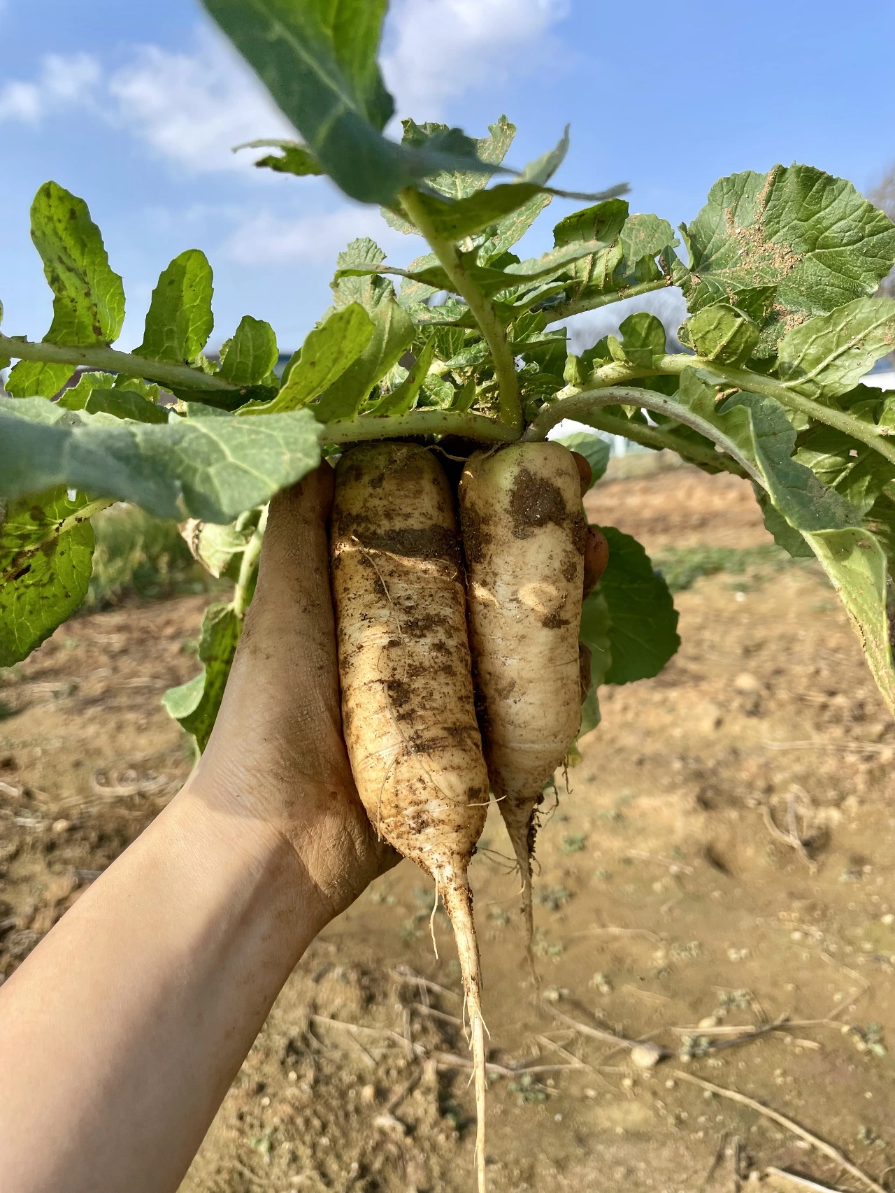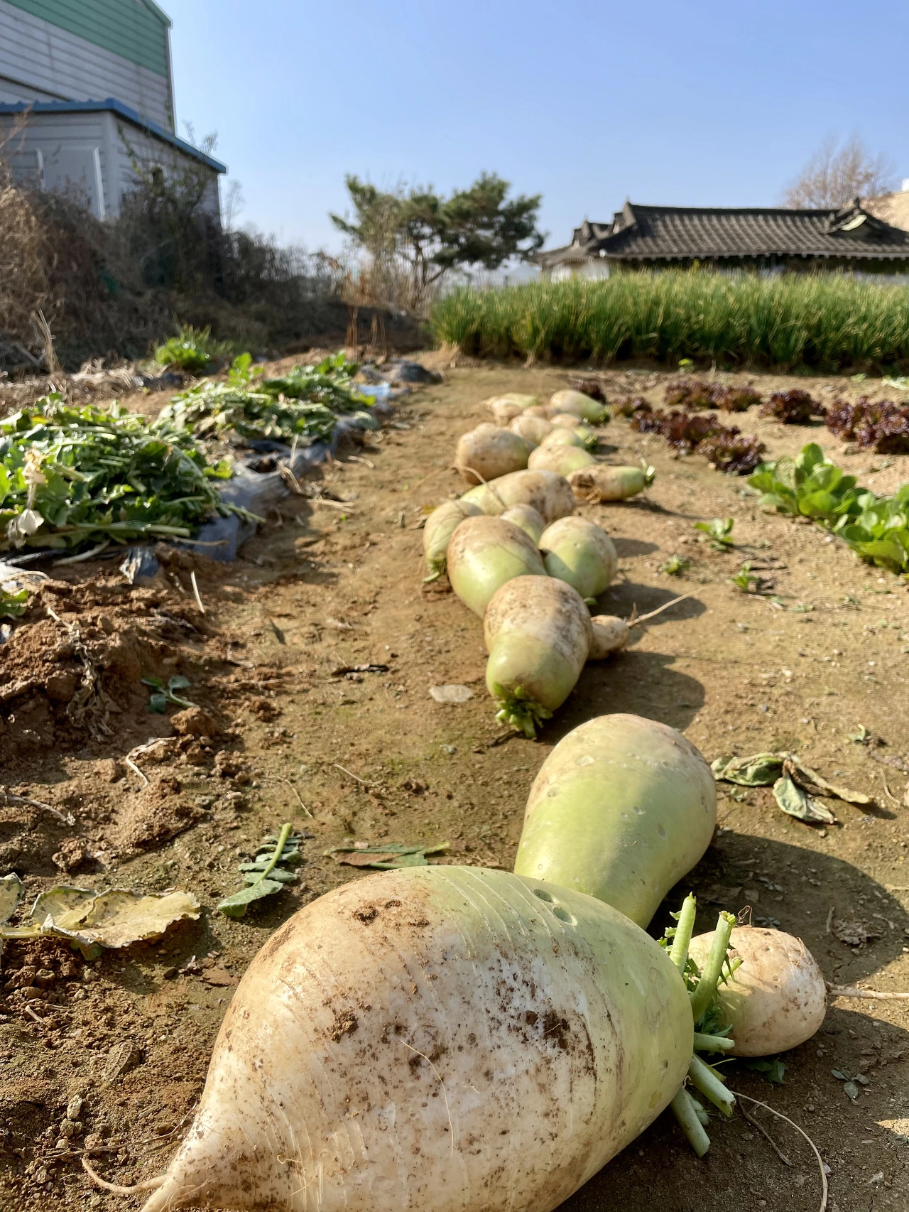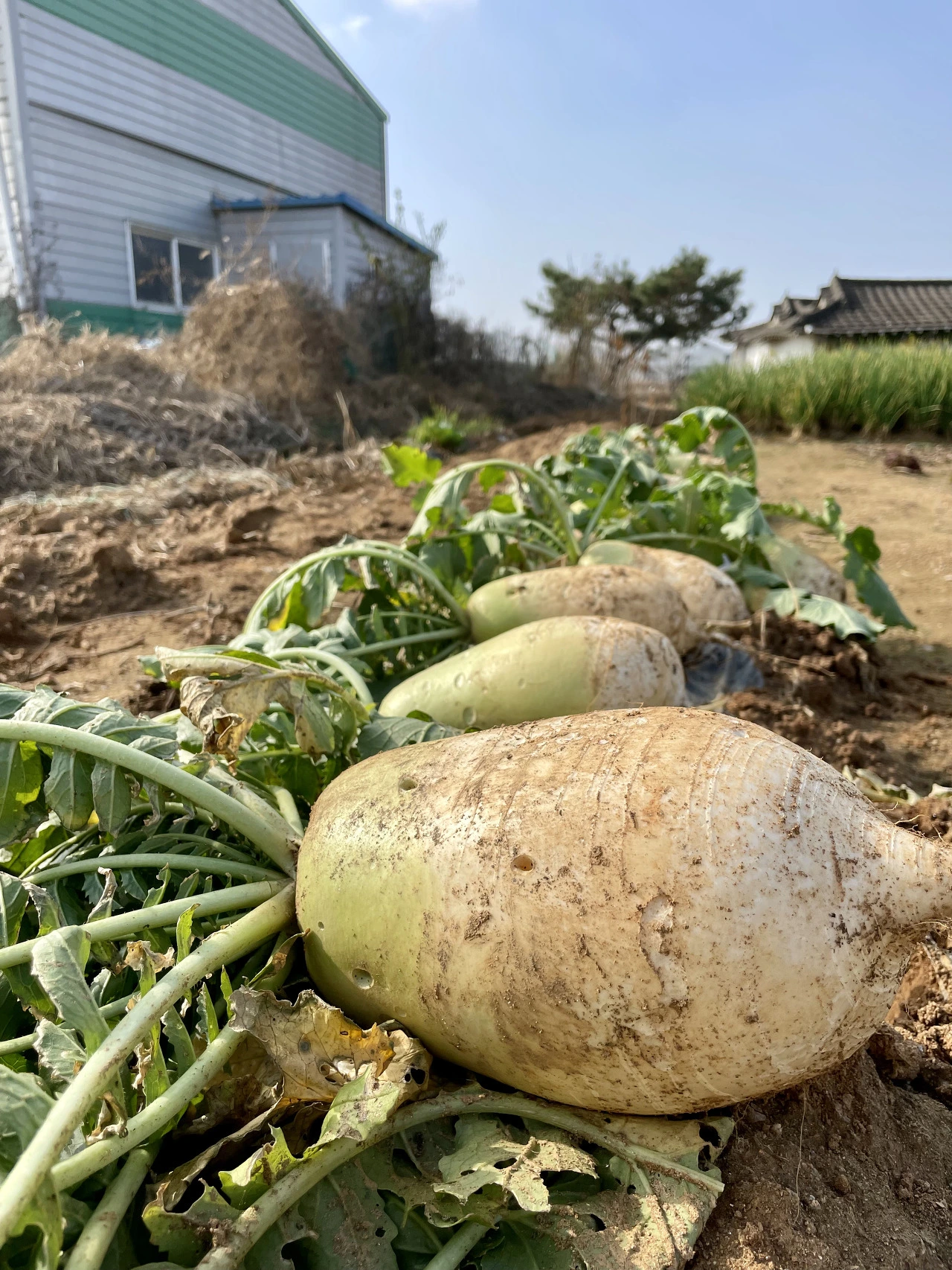 김장하면 빠질 수 없는 김장무와 총각무 역시 저희 밭 한쪽에 자리를 잡았습니다. 똑같이 키운 무인데도, 김장무는 생각보다 크기가 작았고, 총각무는 딱 적당한 크기로 아주 잘 자랐더군요. 도대체 왜 이런 차이가 있는 건지, 농사라는 건 지을 때마다 아리송합니다. 예측해보건대 김장무는 좁은 공간에 비좁게 자라다 보니 크게 자라지 못한데 반해, 총각무는 추가로 받은 텃밭에 넓게 심어서 크게 잘 자라지 않았나 싶습니다.