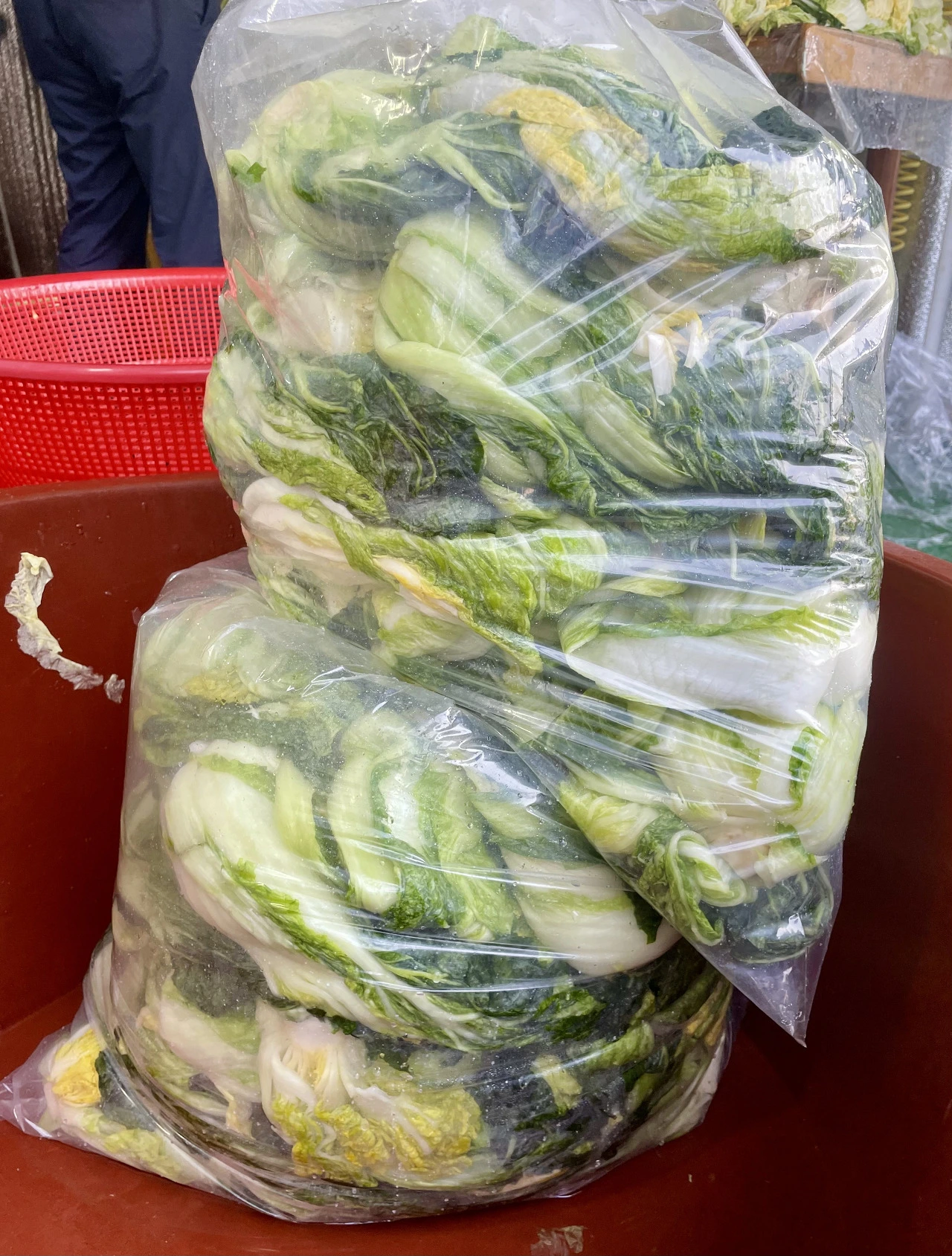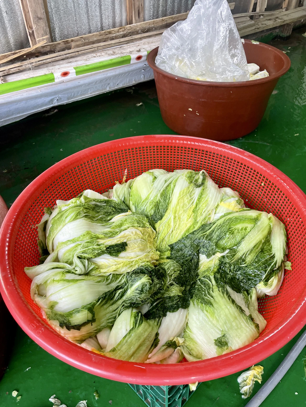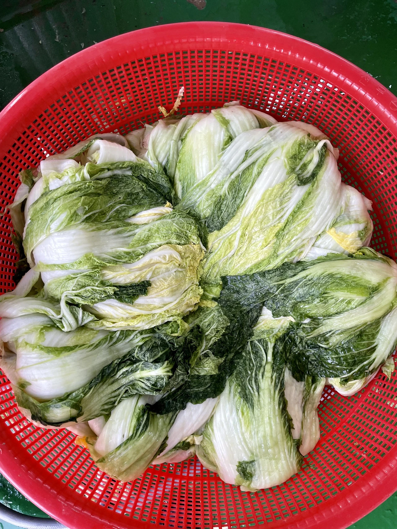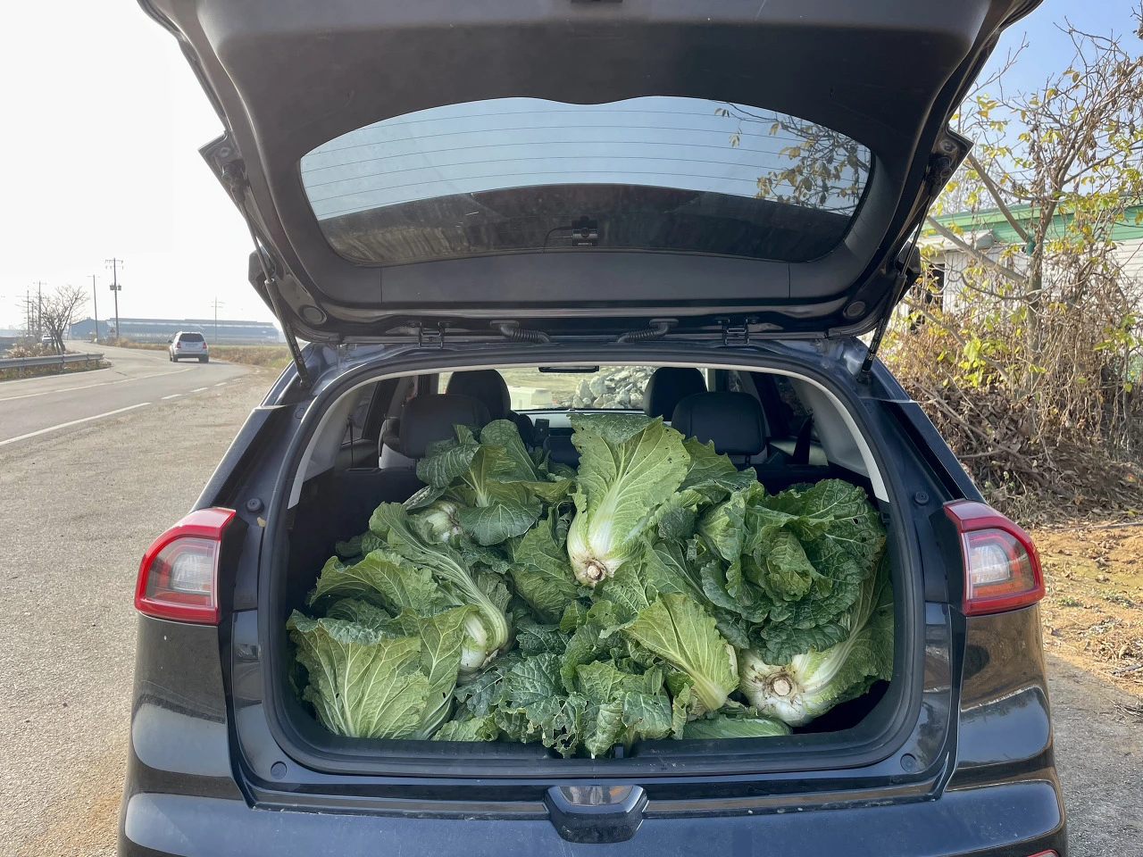 배추들이 잘 절여지려면 거의 하루 정도는 걸린다고 하는데요. 얼마 뒤 찾아간 친구 부모님 댁에서, 놀랄 정도로 부피가 확 줄은 배추들을 만날 수 있었습니다. 못 먹는 부분은 과감하게 잘라버리고, 소금에 푹 절여진 배추는 다행히 부피가 많이 줄었습니다. 한편으로는 부피가 너무 줄어, 내 배추들은 다 어디로 간 건가 아쉬운 마음도 조금 들더군요. 절여진 배추와 김장재료를 차곡차곡 차 트렁크에 넣어보니, 차 한가득 김장재료 냄새와 흙먼지로 가득 찼습니다. 차는 비록 세차가 필요한 꿉꿉한 신세가 되었지만, 태어나서 가장 뿌듯한 김장을 할 생각을 하니 어깨춤이 절로 납니다.