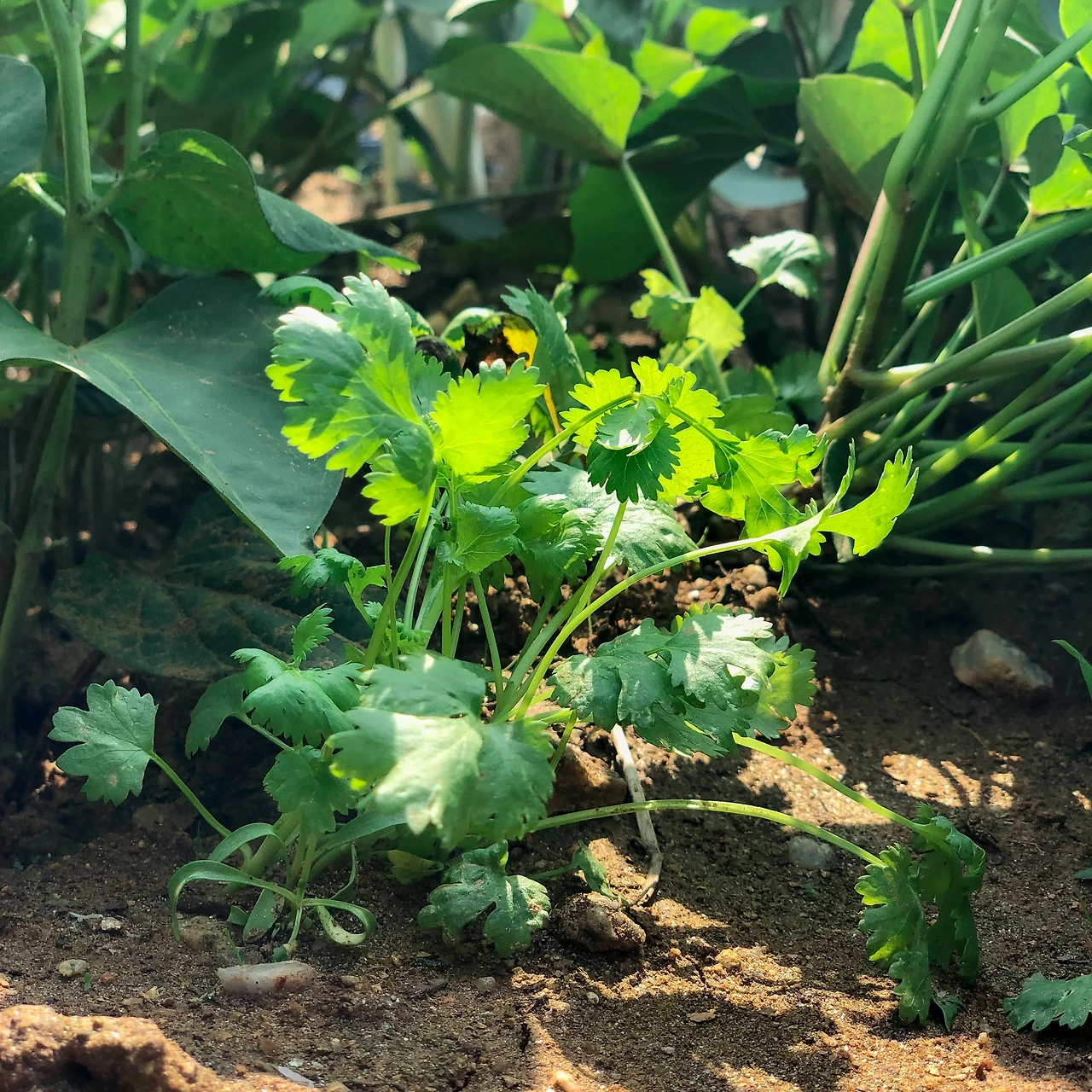 내가 고수를 심은 땅은, 한때 아무것도 안 자라 마치 빈 텃밭처럼 보였다. 그때를 놓치지 않고 부모님께서는 고수 밭에 고구마를 심으셨었다. 무성한 고구마 잎 사이로, 그 땅에서 먼저 깊이 자리 잡았던 고수가 마침내 나를 보며 인기척을 하고 있었다. 나는 녀석을 한눈에 알아보았다.