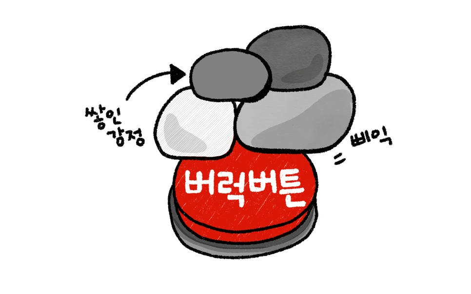 결국, 감정이 그때그때 다루어지지 못하고 억눌리게 되면 쌓이고 쌓여 눈덩이 처럼 불어나고 결국엔 이 감정 덩어리가 나도 모르게 <버럭버튼>을 수시로 누르게 되버린답니다.