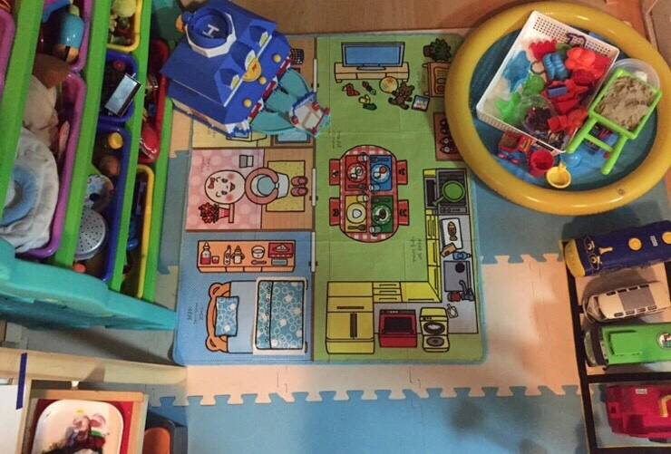 불럭공간 옆 역할놀이를 할 수 있는 공간에는 바구니마다 음식, 자동차,동물피규어, 인형피규어, 병원놀이 등을 넣어주었어요. 그리고 저는 소꿉장난을 하면서 모래를 같이 쓸 수 있도록 가까이 두었어요. 이건 아이의 관심에 따라 얼마든지 빼거나 추가하실 수 있어요. 그리고 저는 호비를 구독하지는 않지만 어디서 얻어온게 있어서 그림매트를 에코폼놀이매트위에 깔아주었는데요, 찾아보니 이런 그림매트 많더라구요^^* 아이 나름대로 소꿉놀이 할때 활용하며 놀이하는 것을 보니 좋은 것 같아요-!