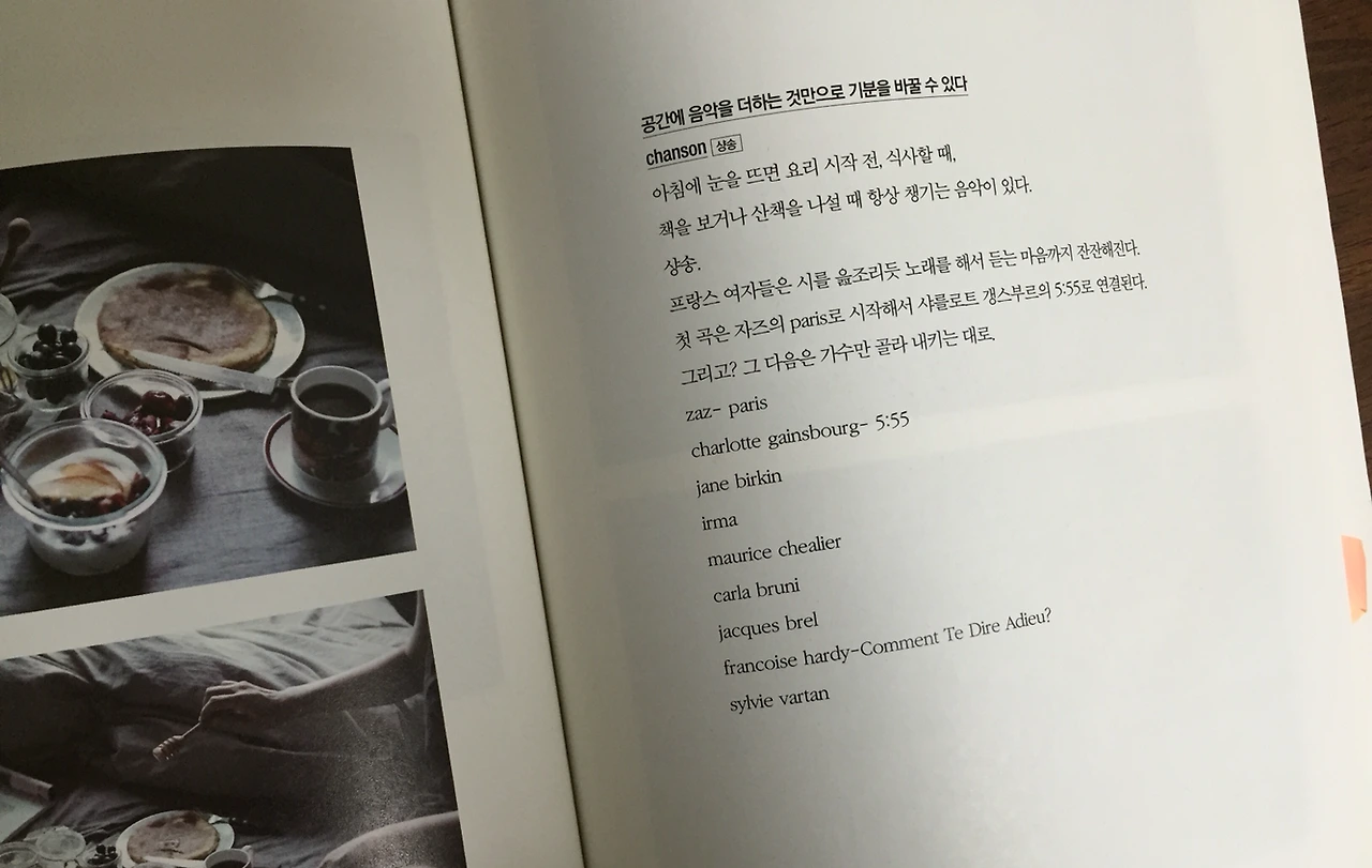 또, 얼마전에 아따블르파리 라는 요리책을 보면서도 비슷한 부분을 발견했었어요. 요리를 하거나 집안일을 할때 상송이나 좋아하는 음악을 틀면, 혹은 좋아하는 와인이라도 한잔 두고 요리를 하면, 공간에 의미가 더해진다는 부분이었어요. 그 뒤로 저 역시 종종 집안일이 하기 싫은 날에는 음악을 틀고 요리를 하거나 청소를 하곤 해요. 그러면 신기하게도 기분이 조금은 달라지고 나의 움직임에도 활기가 생기더라구요.