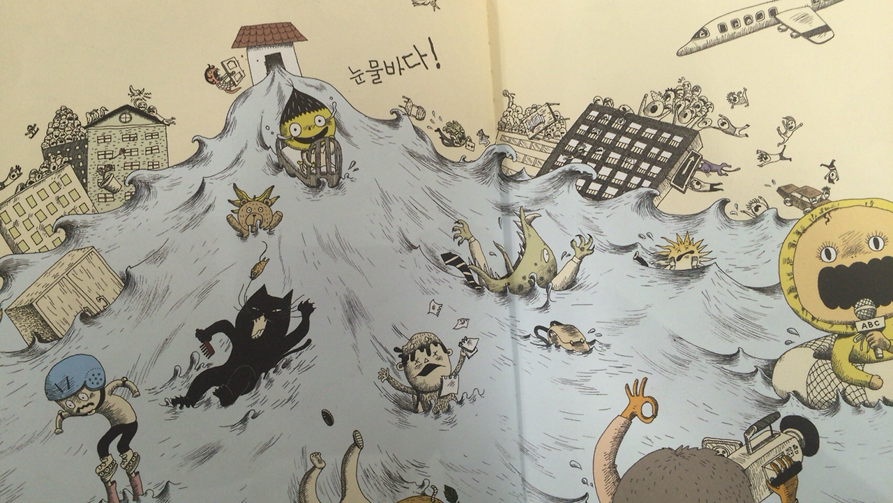 꼬마는 누워서 훌쩍훌쩍 울기시작합니다. 그런데 이게 왠일이죠? 정신을 차려보니 눈물이 모여 바다가 되어버렸어요. 온종일 기분나쁘게 했던 것들이 다 휩쓸려 내려가요.