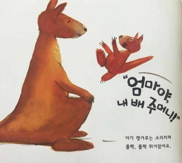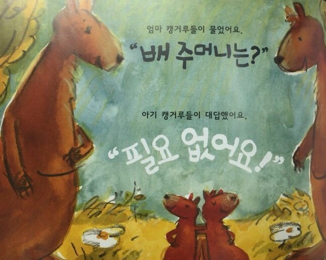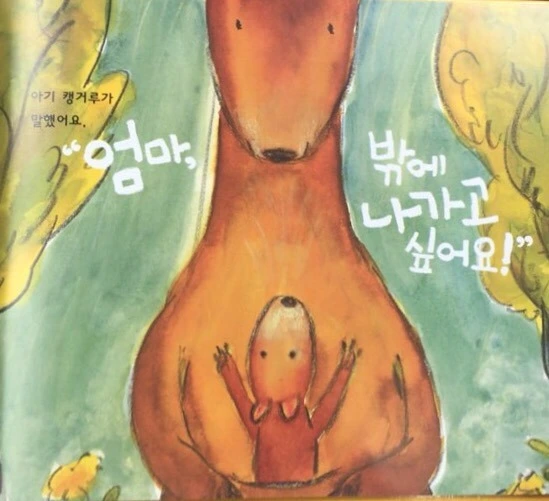 그리고, 드디어 여러번의 시도끝에 아기캥거루는 세상으로 완전히 나올 수 있게되었어요. 엄마캥거루가 "배주머니로 들어올래?" 라고 했지만 아기캥거루는 이렇게 말했어요