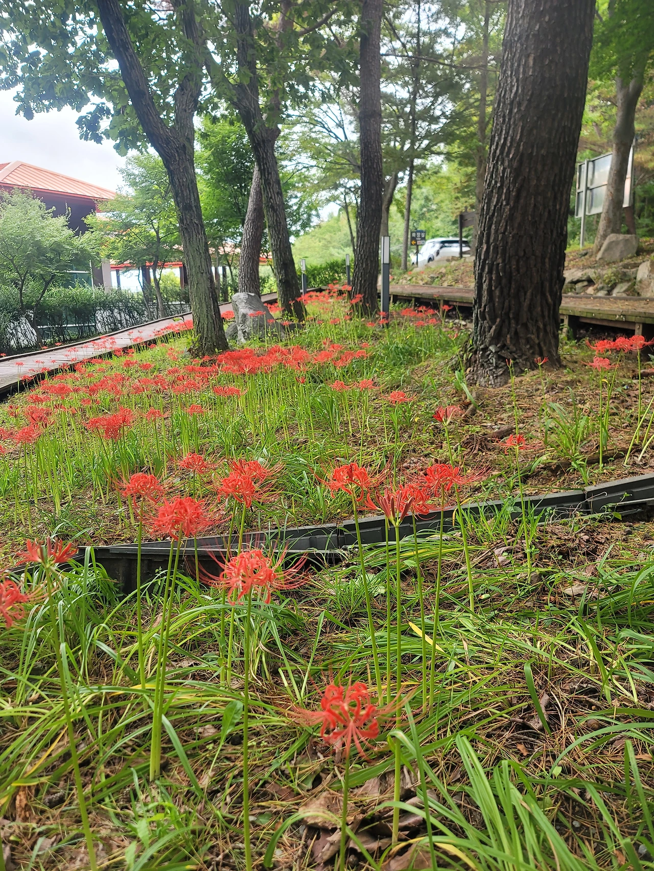 나무 사이 작은 공간에 붉은 꽃들이 물결을 이루고 있다.