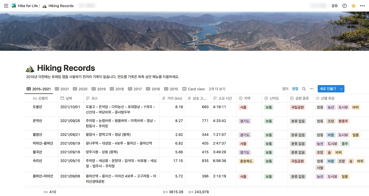 2011년 9월의 이름도 없는 동네 뒷산을 다녀온 게 첫 산행이에요. 그전까지는 등산을 싫어했어요. '다시 내려올걸 왜 힘들게 올라가지'라고 생각하는 사람 중 하나였죠. 근데 산이 정말 운명처럼 다가왔어요. 그날이 일요일이었는데 아침에 불현듯 뒷산에 가봐야겠다는 생각이 들었어요. 동네 편의점 가는 복장처럼 운동화에 운동복을 입고 뒷산에 1시간 다녀왔는데요. 집에 돌아와 ‘이제 산을 사랑하게 되겠구나’라고 생각했어요. 그리고 그때부터 13년째 거의 매주 산을 다니고 있고요. 2020년부터 3년째, 1주 1산을 꼭 하고 있어요.