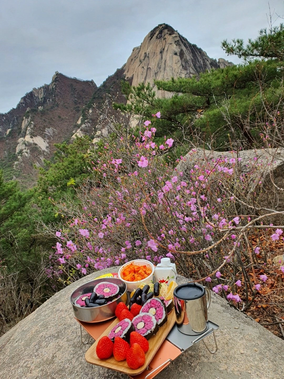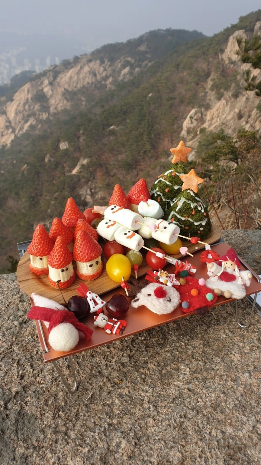 젊은 친구들이 등산할 때 먹을걸 잘 챙겨 다녔으면 좋겠어. 산에서 잘 먹어야 하는 이유는 세가지야. 우선 등산하느라 배가 너무 고프고, 하산 잘하려면 에너지를 든든히 섭취해야 해. 그리고 산 정상에서 아름다운 뷰를 보면서 무언갈 먹는 건 맛을 더 돋구어죠. 서울에 고급스카이라운지는 쨉도 안돼. 다이어트한다고 너무 안 먹어. 항상 방울토마토든 귤이든 넉넉하게 들고 가서, 힘들어 보이는 친구들 있으면 주는데, 한입 먹고 는 다들 눈이 휘둥그레지더라고. 같이 고생하고 난 뒤 뭘 먹으면 그 맛과 행복이 배가 돼. 그 맛에 도시락 싸는 거야.