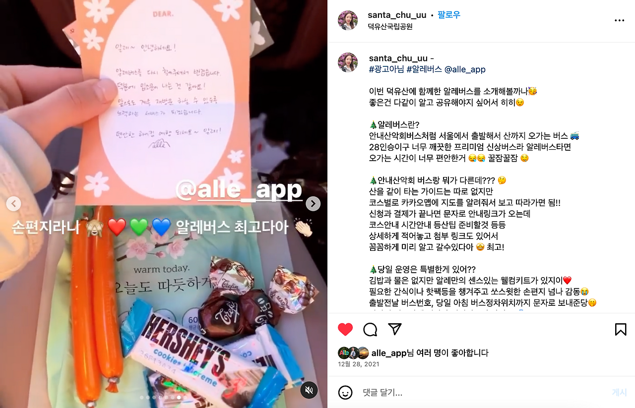 알레 서비스와 이용자가 같이 성장한 게 느껴질때요. 저희는 이용자가 SNS(블로그, 인스타그램 등)에 올려준 후기글 다 읽어봐요. 사실 이용자 덕분에 이 사업을 계속할 수 있는 건데, 오히려 '알레 덕분에 이 먼 산에 혼자 다녀왔다', '알레의 촘촘한 가이드가 없었으면 아마 생각조차 못했을 텐데 진짜 가이드 잘 돼있다' 등 저희 서비스를 토대로 등산 경험의 틀을 넓혀 도전하는 했다는 걸 읽으면 감동이죠.