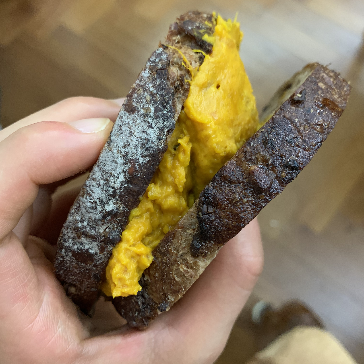 다음날 가을 아침. 호밀빵을 프라이팬에 바삭하게 굽고, 그 위에 밤호박 스프레드를 듬뿍 담아 샌드위치를 만들었다. 두 쪽으로 나눠 엄마와 먹었다. 우린 재료들이 조금씩 부족한 밤호박 샌드위치를 먹으며 행복했다. 엄마에게 큰 쪽 줘서 그런가 조금 배고픈 듯했지만, 욕심내지 않기로 했다. 곧 점심이 올 테니깐.