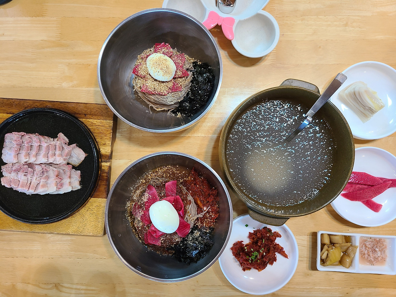 이번 여행에서는 열흘을 보낸 만큼 다양히도 먹었다. 우리 부부는 면을 좋아한다. 관동지방에서는 비빔면 위에 매콤 달콤한 명태회를 올리는데 막국수는 물론 냉면에도 잘 어울렸다. 육수를 부어가며 감칠맛을 달리하는데 처음에는 자박하게 넣었다가 점점 육수양을 늘려가며 간을 조절하는 재미가 있다. 식초나 겨자 등도 비치되어 있었으나 본 양념이 훌륭해서 손을 대지 않았다. 전국적으로 백촌 막국수가 유명한데 현지 호스트의 추천으로 방문한 금화정 막국수는 여태 먹어 본 비빔 막국수 중 최고였다. 또 다른 추천 식당인 백도 막국수는 다음 기회에. 고향냉면은 숙소 앞인데다 중식도 함께 먹을 수 있어서 방문하였다. 매운 음식을 먹지 못하는 첫째 유나에게는 볶음밥을 줬다. 신발을 벗는 곳임에도 흔쾌히 유모차를 들여준 마음만큼이나 음식도 정갈했다. 회냉면도 맛있었지만 냉면 장국이라는 사골육수는 감칠맛이 대단했는데 유나가 한 그릇을 다 먹었다.