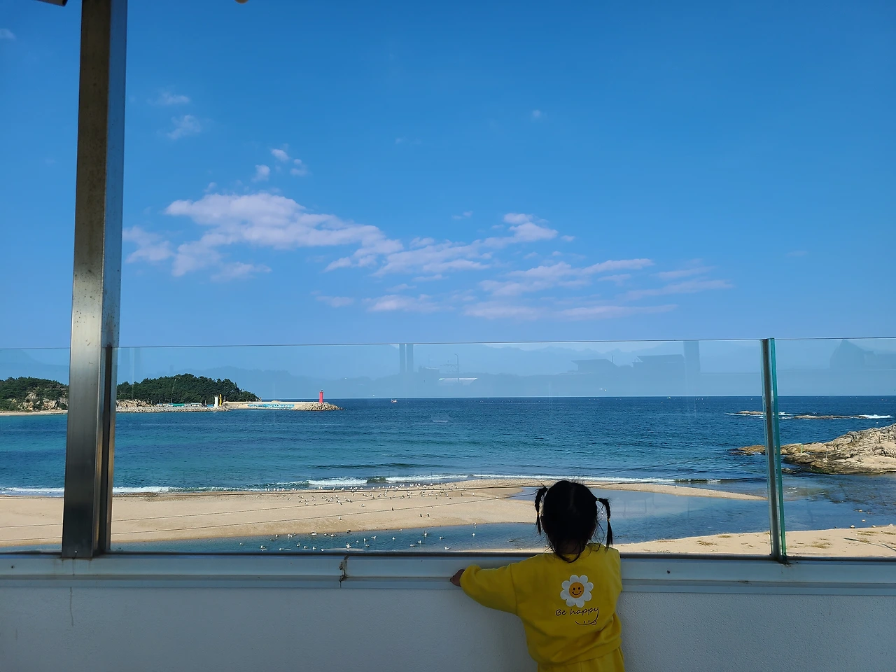 차를 타고 돌아다니기도 했다. 숙소에서 가진항까지 해변길로만 드라이브를 하면서 만난 자작도 캠핑장과 연수원 사이에 놓인 바다는 한동안 차를 멈추게 할 만큼 아름다웠다. 이날 내비게이션을 쓰지 않고 다니다 만난 카페 온더버튼의 루프탑은 우리 부부에게 푸른 바다를 보며 잠시 생각을 비우는 여유를 선물해 주었다. 덥지도 춥지도 않은, 습하거나 마르지도 않은, 가을 그늘 아래 귀밑으로 흘러드는 바람. 그런 날 그런 시간에 잠시 기댈 수 있어서 좋았다. 카페 스퀘어루트와 바다정원은 해변에 접하여 유나를 데리고 나가 놀 수 있어서 좋았다. 모래놀이를 한참 하고 나면 아이도 돌아오는 차에서 만족스럽게 잠이 들었으니까. 청간정에는 두 번을 갔는데 채규하 대통령이 남긴 글귀가 인상적이다. 악해상조고루상嶽海相調古樓上 과시관동수일경果是關東秀逸景. 부족한 한자 실력으로 더듬더듬 해석하고 인터넷을 찾아보니 조금 틀렸다. 과果는 결과가 아니라 과연으로도 쓰이는구나. 청간의 앞바다엔 암초가 있나 보다. 멀리서부터 하얘진 물결이 닿는 모래 위에선 갈매기가 줄을 지어 논다. 시기가 아직 단풍이 들지는 않았더라도 가을 산도 멋졌다. 비록 직접 오르진 않았지만 진부령 중턱 쉼터에서 자는 애들을 차에 놓고 우리만 내렸다. 도시락을 먹는 노부부 옆, 구름 바로 아래에서 말없이 그리고 잠시 그렇게 있었다.