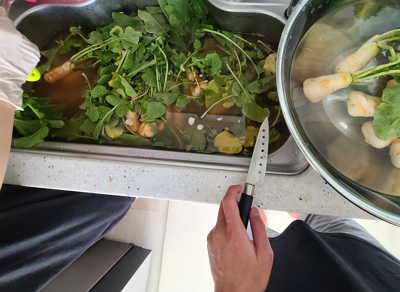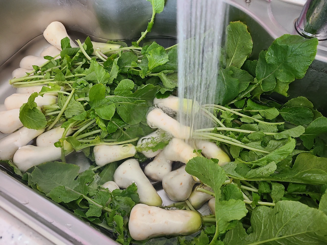 한 달쯤 되었을까. 추석이 지나고 전을 부치려 구매한 믹서기와, 전을 부치고 남은 쪽파로 김치를 담근 적이 있다. 유튜브 영상 서너 개를 보고 적당히 계량했는데 생각보다 맛있어서 먹을수록 줄어드는 게 아까웠다. 그때의 성공 경험에 홀린 듯 자신감은 날개를 편다. 김치가 비싸면 내가 담그면 되지. 까짓것 할 만하던데. 청과상에 들러 총각무를 골랐다. 한 단을 고르니 아주머니께서 김치 할 거면 하나 더 하라신다. 엉겁결에 두 단에 쪽파까지 샀다. 돌아와서 알타리무, 총각무 도대체 뭐가 맞는지 찾아보았다. 조선시대 미혼 남성들이 양갈래로 동여 맨 머리를 총각(總角)이라 하는데 그 모양을 닮아 표준어가 총각무, 총각김치로 제정되었단다. 총각이 한자어인 것도, 동여 맨 머리를 가리킨 것도, 혼인을 늦게 할수록 총각이 커져서 더벅머리 또는 떠꺼머리라는 말이 생긴 것도, 이번에 알았다. 이럴 때 국어 공부가 재미있다.