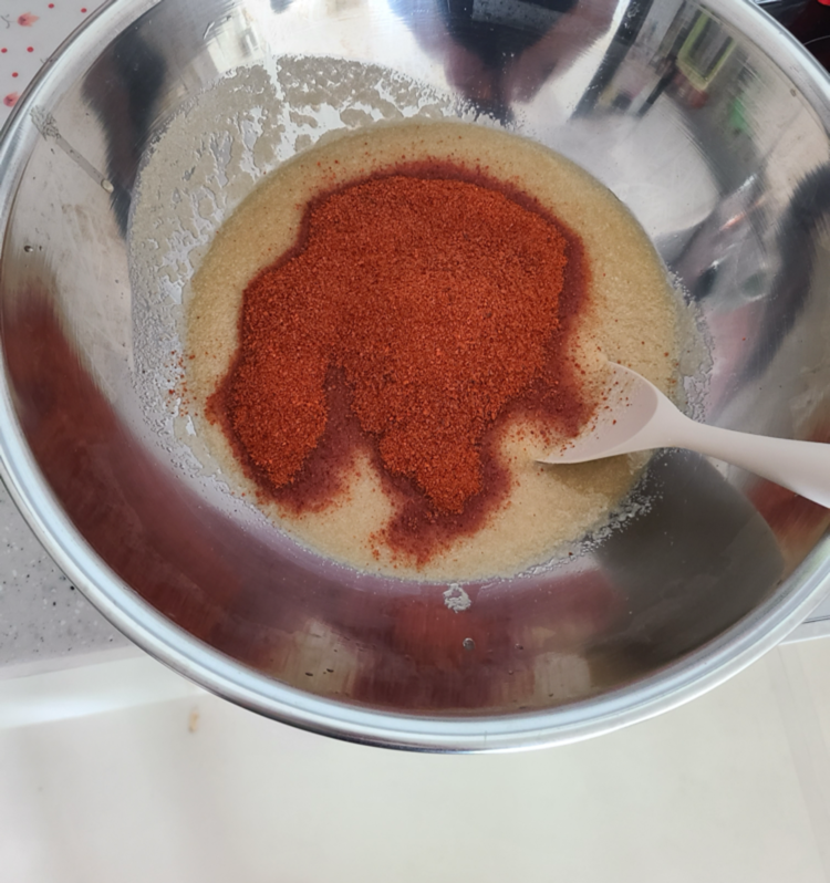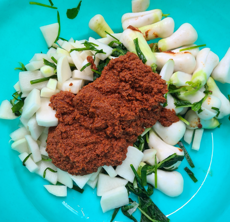 절인 채소와 김칫소. 집에 있던 고춧가루를 모두 털었다.