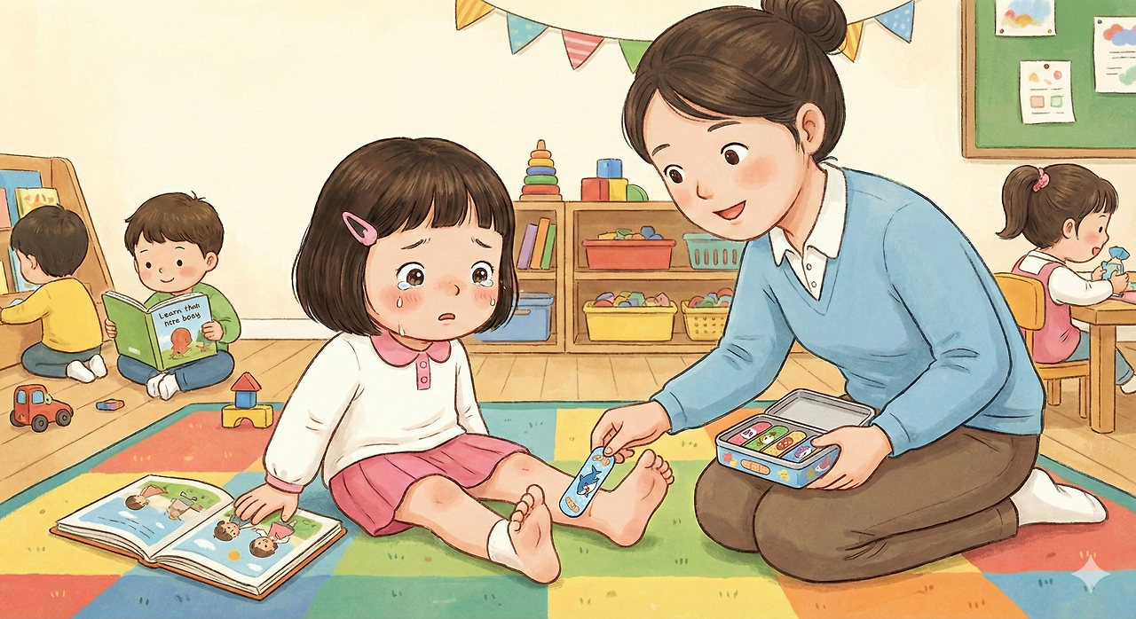 이 시기의 아이들은 자신이 존중받고 있다는 확신을 필요로 하며, 교사가 즉각적으로 반응하고 공감하는 태도는 아이에게 안정감을 주고 감정을 수용받는 경험을 제공합니다. 또한 캐릭터 반창고와 같은 상징적 도구는 단순한 치료 도구를 넘어 아이의 상상력과 심리적 위안을 자극하는 매개체가 되어, 아픔을 치유하는 동시에 마음의 상처를 달래는 역할을 합니다. 이는 유아가 외부의 작은 상징을 통해 정서적 회복을 경험하고, 놀이적 요소가 결합된 상황에서 자기 조절 능력을 조금씩 키워가는 과정이라 할 수 있습니다. 교사가 아이의 울음을 단순히 진정시키는 데 그치지 않고, 아이가 다시 일어나 활동에 참여할 수 있도록 긍정적인 경험으로 전환해 주는 순간은 유아기의 발달적 과제인 자기 효능감과 회복탄력성을 길러주는 중요한 교육적 개입이 됩니다.