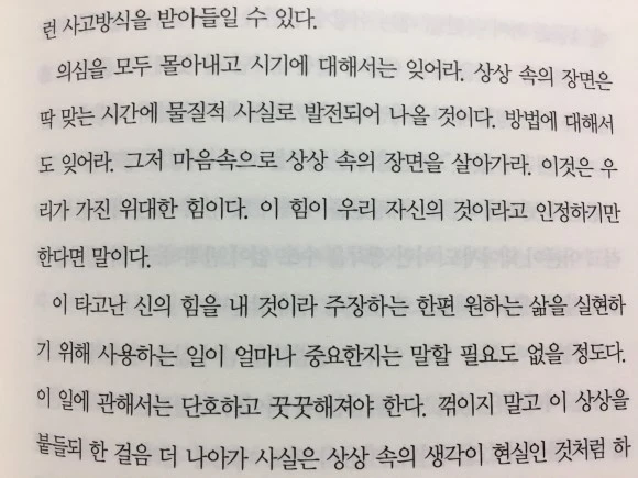 이 책에서도 마찬가지로 내가 원하는 것, 내가 의도하는 것을 나의 상상속으로 집어넣어 몰입하는 것을 중요하다고 이야기한다. 원하지 않는 것, 쓸데없는 걱정들은 모두 버리고 원하는 것에만 집중하는 것이 필요한다.