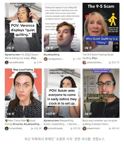 이는 전 세계적으로 바이러스처럼 퍼져 나가 '조용한 사직(Quiet quitting)'이라는 챌린지까지 벌어질 정도였다. 조용한 사직이란 '직장에서 최소한의 일을 하겠다'라는 의미로, 승진이나 더 많은 급여를 받기 위해 내 업무 범위 이상의 업무를 하지 않는 허슬 컬처를 거부하는 것이다.