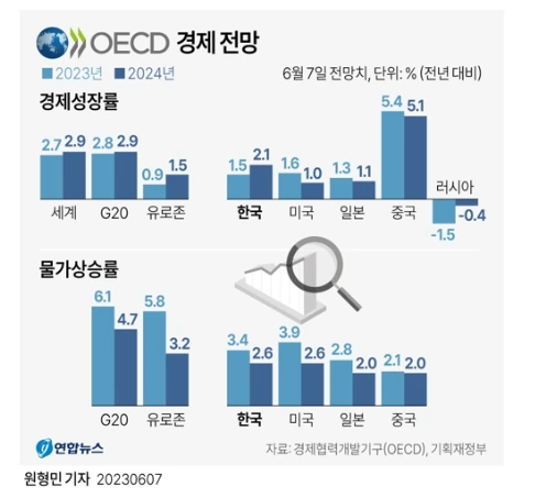 경제협력개발기구(OECD)는 2023년 대한민국 예상 경제성장률을 1.6%에서 1.5%로 하향 조정하였다. 내년 성장률 또한 2.3%에서 2.1%로 하향 조정해 대한민국의 경제 침체 가능성을 높게 평가하였다. 이 수치는 같은 발표에서 세계 경제성장률을 2.6%에서 2.7%로 상향 조정했다는 점에서 큰 시사점이 있다.