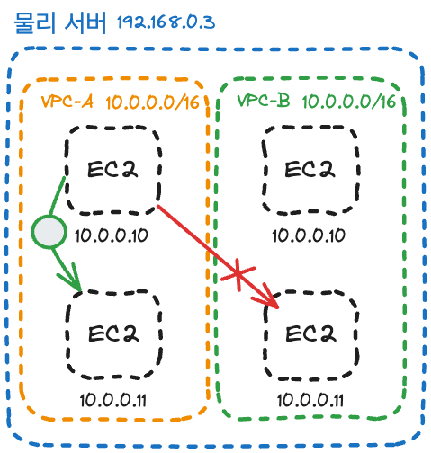 이 경우 VPC-A의 10.0.0.10 서버는 VPC-A의 10.0.0.11과 통신할 수 있다. 하지만, VPC-B의 10.0.0.11과는 통신이 불가능하다. 설령 두 서버가 모두 같은 물리 서버에 존재한다고 해도 동일하다.