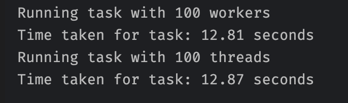 결과를 보면, 다음과 같다. 싱글 스레드로 돌렸을 때 12.81초, 멀티 스레드로 돌렸을 때 12.87초로 거의 비슷한 시간이 걸렸다. 이런 경우라면 굳이 멀티 스레드로 코드를 구현할 필요가 없다.