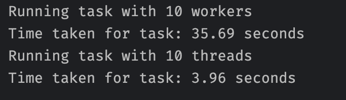 결과를 보면, 싱글 스레드로 돌린 경우 35.69초, 멀티 스레드로 돌린 경우 3.96초 만에 종료되었음을 알 수 있다. 대략 스레드 수만큼 차이가 난 셈이다. 따라서 네트워크 작업이 빈번하거나, 파일 읽기/쓰기 등의 작업이 많다면, 멀티스레드로 구현하는 게 조금이나마 성능을 개선할 수 있는 포인트가 될 수 있다.