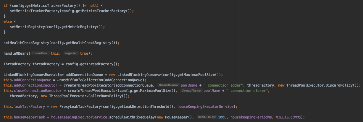 이렇게 Connection 체크를 완료하고 나서 pool 관리에 필요한 각종 변수들의 초기값을 세팅합니다. 여기서 하나 보실만한 것은 handleMBeans() 함수입니다. MBeans는 hikari의 각종 지표를 수집해주는 JMX 모니터링을 등록하는 객체입니다. 즉 모니터링 지표를 수집하고 싶을 때는 이 MBeanServer를 생성해야 합니다. 이때 필요한 Java Spring Configuration은 register-mbeans값 입니다.