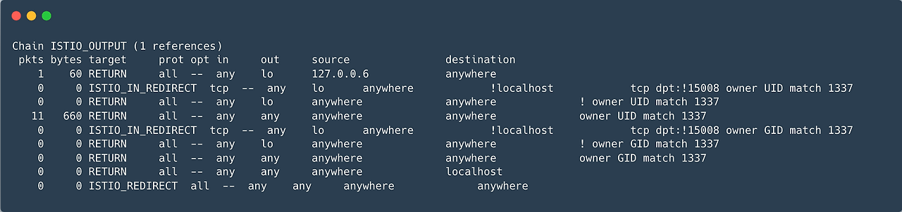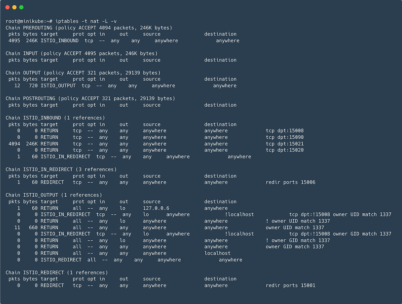 위 설명대로 명령어를 실행하면 istio-iptables는 파드의 리눅스 네임스페이스 상에 iptable 규칙을 추가한다. 해당 iptable은 파드 내에서 동작하는데, 결론적으로 프록시가 트래픽을 가로채기 위한 설정이다.
