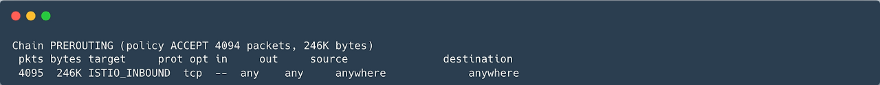 1. 트래픽은 PREROUTING을 거쳐 ISTIO_INBOUND로 넘어간다. 왜냐하면 PREROUTING에서는 모든 트래픽을 ISTIO_INBOUND 타깃으로 전달하기 때문이다.
