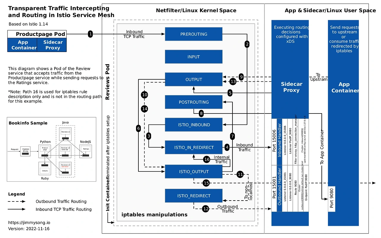 istio는 iptable을 조작하여 프록시로 트래픽을 전달한다. 여기서 iptable은 파드의 네임스페이스 내 iptable을 의미한다. 각 파드는 독립된 프로세스이고, 파드별로 별도의 리눅스 네임스페이스를 가진다. 각 파드 내에서 프록시는 15001, 15006번 포트를 사용하고, 자신의 리눅스 네임스페이스에 정의된 iptable 규칙에 따라 패킷을 라우팅 한다.
