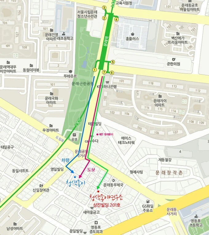 지하철로 오실 경우 2호선 문래역 7번 출구로 나옵니다.