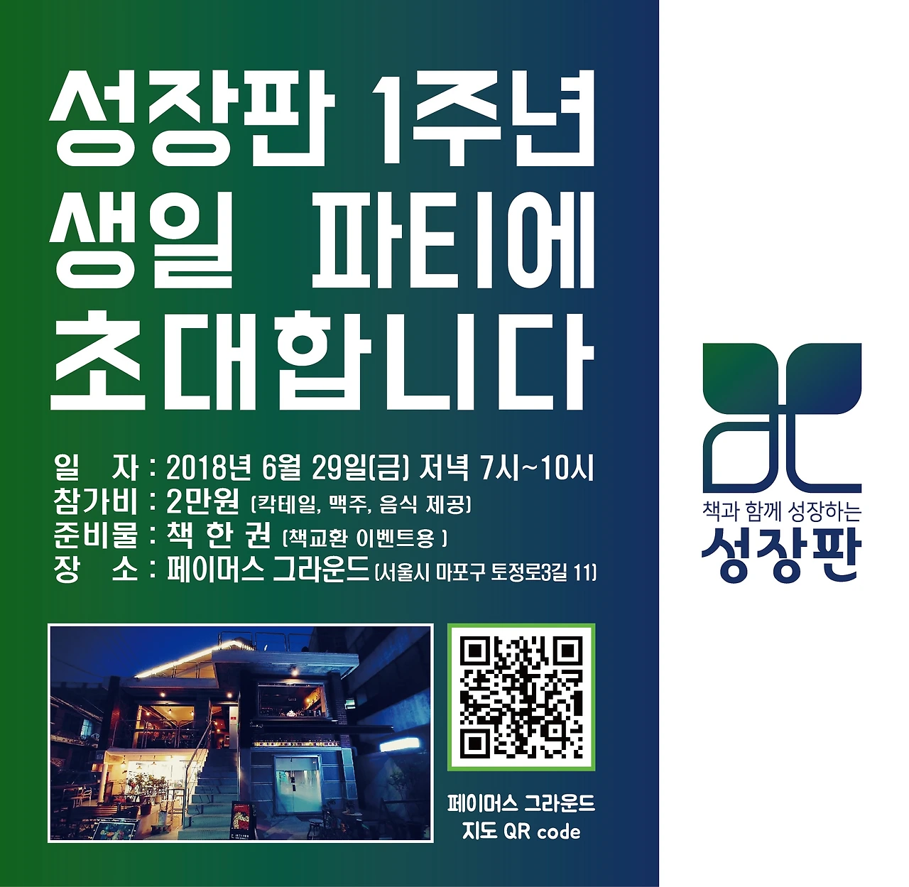2017년 6월 21일 문래동 청색종이에서 성장판 첫 번째 독서 모임이 열렸습니다. 지난 1년 동안 문래/강남에서 매월 독서 모임이 꾸준히 열렸고, 성장판 단체 채팅방에 참여하는 분들이 어느새 400명을 넘어섰습니다. 독서 모임 활동 외에도 글쓰기 습관반, 외국어 공부방, 감사일기방, 스팀잇 글쓰기방, 명상방 등 다양한 소모임 활동을 통해 함께 성장해 왔습니다.