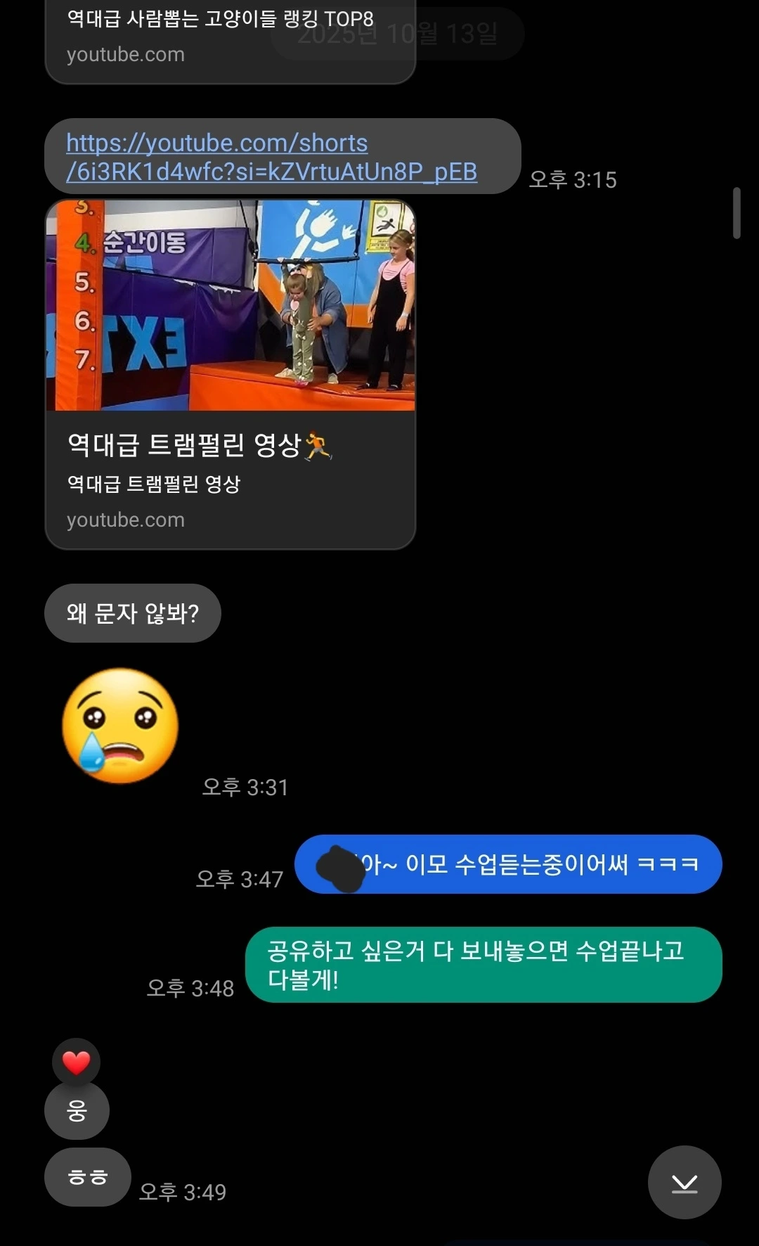 무튼 음성메시지 이후로도 내가 바빠 확인이 늦어도 꾸준히 재밌고 귀여운 영상들을 보내주던 아이에게 어제 문자가 왔다.