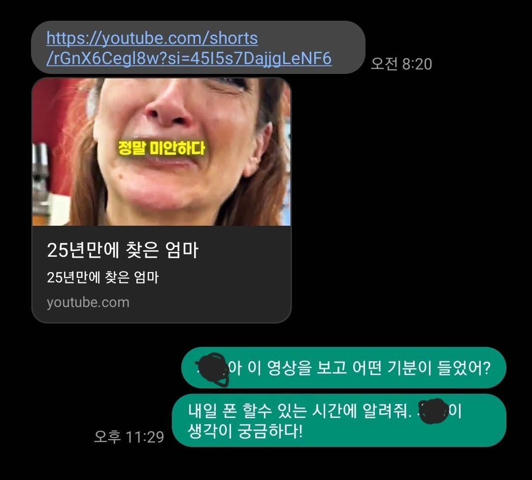 소통데이의 하루 끝 마무리로 그 아이와의 문자를 설레는 마음과 함께 열었는데, 영상의 제목은 "25년 만에 찾은 엄마"였다.
