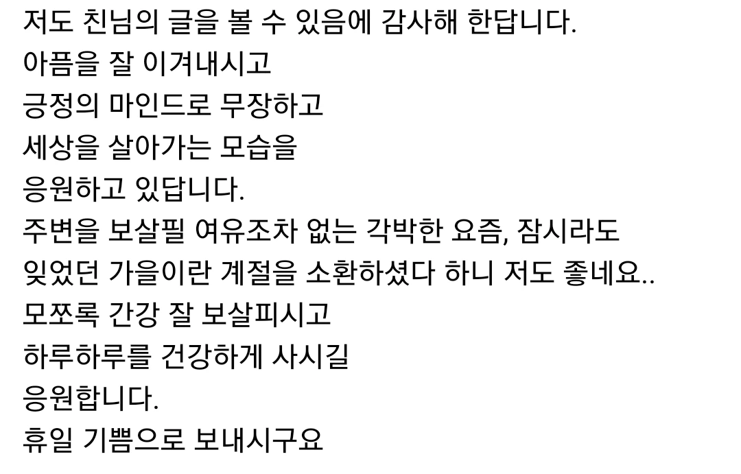 아! 그리고 맞팔되어 있는 스친이들은 글도 잘 쓰신다. 읽는 재미가 쏠쏠하다. 그러니까 많이많이 써 주세요. 삶의 지혜 같은 무거운 거 말고, 눈에 담는 아름다운 것들을 스친이들의 시선으로 전해주세요. 헤헤