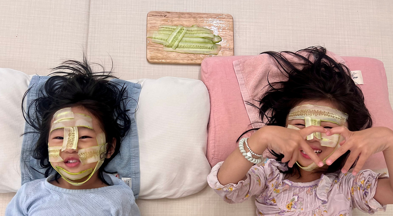 나는 에스테틱 직원처럼 과장된 목소리로 인사를 하고, 오이 조각을 아이들 얼굴에 올려주었다. 아이들은 서로 깔깔 웃으며 가만히 있었다.