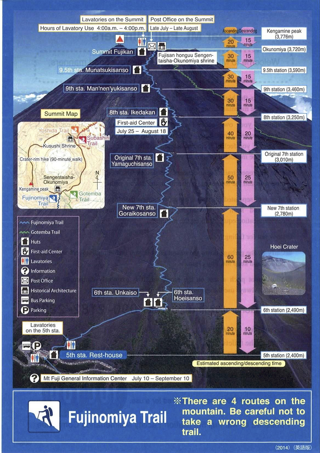 다녀온 경험을 살려 이상적인 일정을 짜 본다면. 9합목에 숙박을 예약한다. 오후 2시쯤 후지노미야5합목에서 등산을 시작한다. 9합목에 도착할 때쯤에는 일몰을 볼 수 있을 것이다.(날씨가 좋다면.) 거기서 저녁을 먹고 쏟아지는 별을 볼 수 있다.(날씨가 좋다면.) 잠을 잔 뒤 새벽 2시 30분쯤 정상으로 향한다. 해 뜰 무렵 정상 부근에는 사람이 많아서 시간이 평소보다 더 걸린다. 후지산 정상에 오르면 신비(할 거라 예상되는) 일출을 볼 수 있다.(날씨가 좋다면.) 방한, 방수 용품 꼭 잘 챙기고.