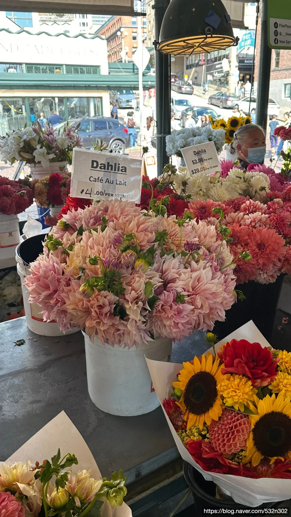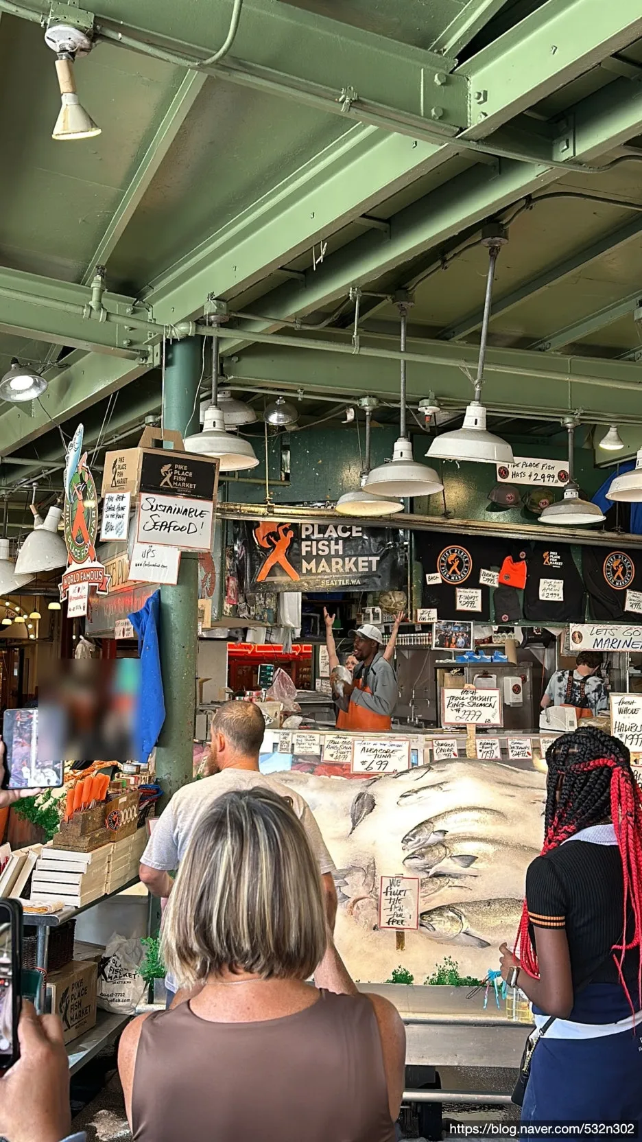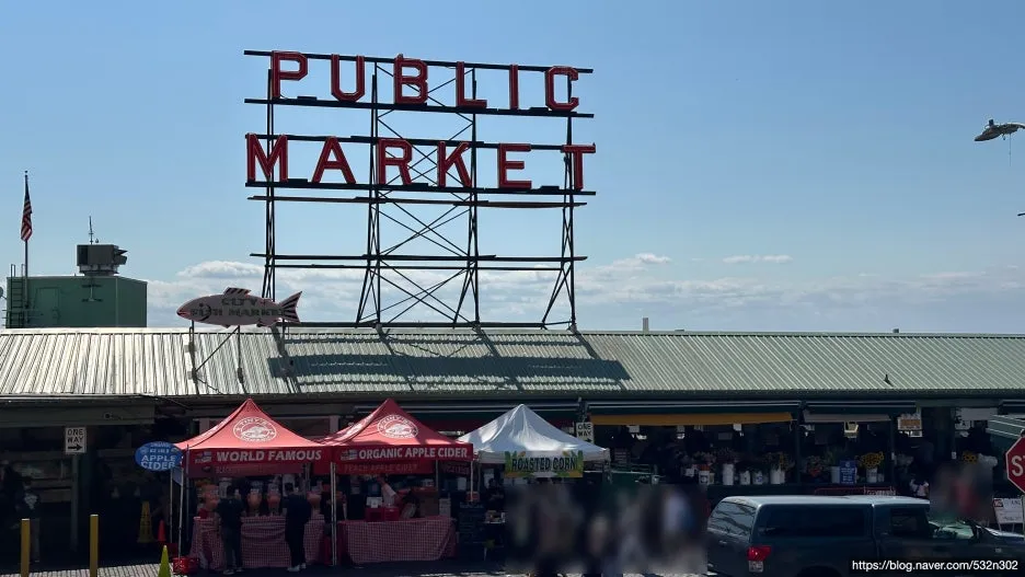 지난번 포스팅했던 파이크 플레이스 차우더(클램차우더 맛집), 핑크 도어가 바로 이곳 근처에 있다. 스타벅스 1호 점도 바로 근처에 있다. 마켓에서는 애플 사이다(비추), 꽃, 생선 등의 농산물 + 해산물 등을 판매하고, 지하 아케이드에는 여러 가지 기념품 가게등이 있다. 피시 마켓에서는 물고기를 던지고 잡는 퍼포먼스를 해 주는데, 우리가 오후에 도착했을 때 가까스로 마지막 퍼포먼스를 볼 수 있었다. 오후 약 4시 30분쯤 구경을 하려 할 때는 파장 느낌이 있었으니 너무 늦게 방문하지 않는 것이 좋겠다.