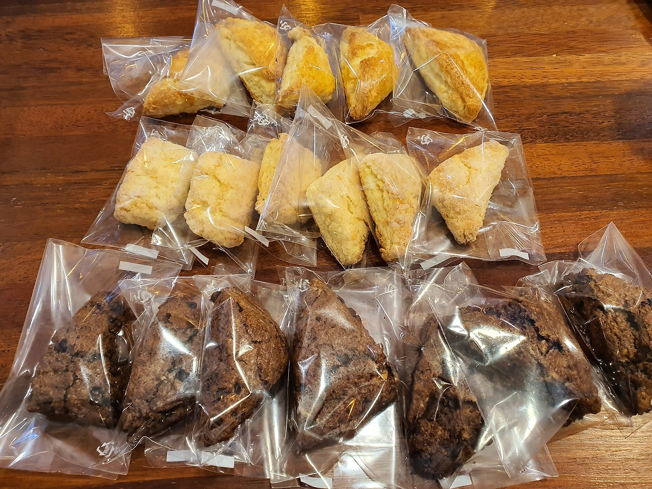 선생님의 지휘에 따라 일사불란하게 움직이고 나자 가게에서나 보던 예쁜 때깔의 스콘들이 완성되었다. 2시간의 수업 시간 안에 완성한 스콘을 차와 함께 즐기는 시간까지 포함되어 있었다. 난 스콘이 그렇게 바삭바삭하고 풍미 있는 줄 처음 알았다. 플레인 스콘과 초코칩 스콘. 나는 초콜릿을 좋아하지 않는다고 생각했는데 내가 만든 초코칩 스콘은 정말 맛있었다. 남은 스콘은 식기를 기다렸다가 하나씩 포장해 와서 두고두고 먹었다.