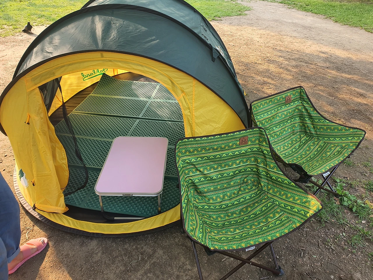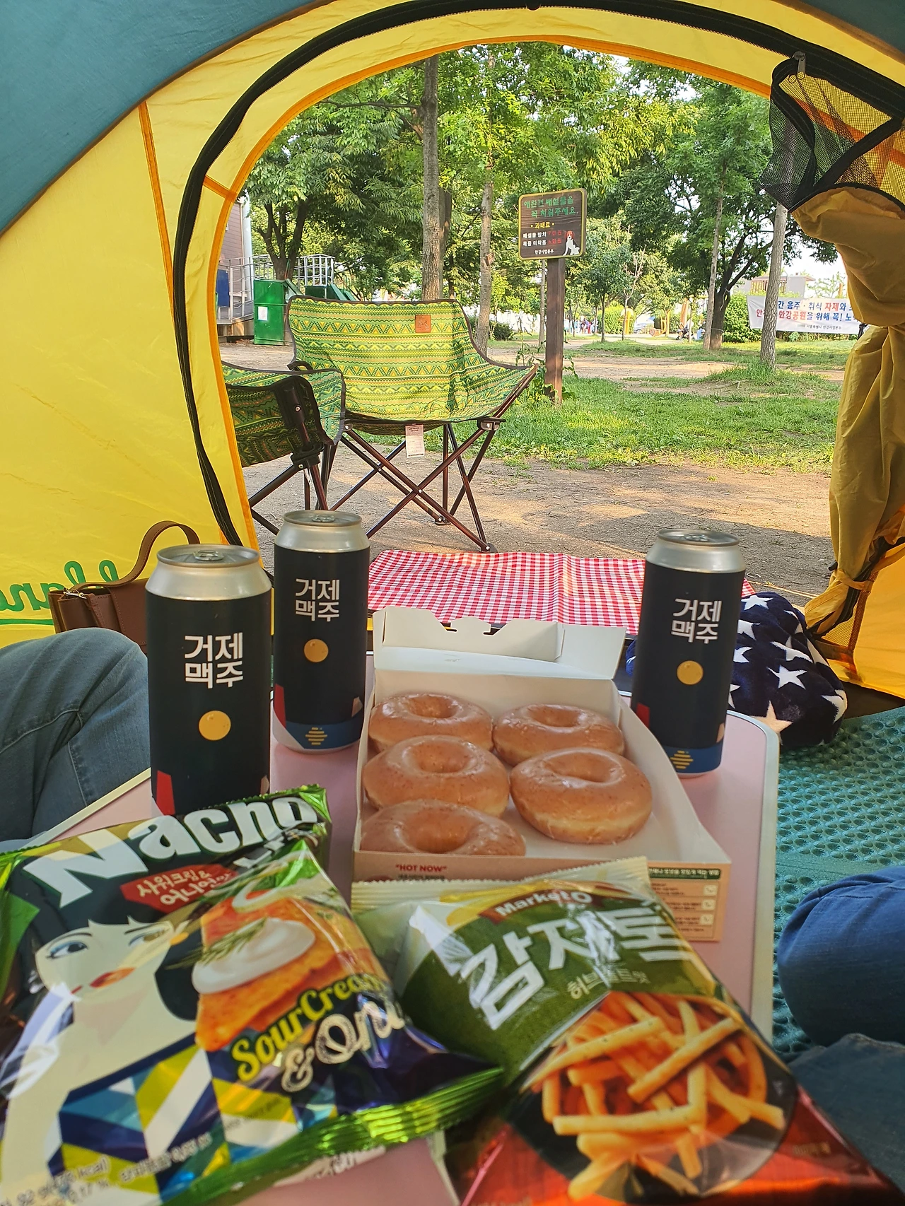 요즘엔 피크닉 용품도 빌릴 수가 있다는 얘기를 들어서 텐트까지 한 번에 빌리고, 제주도에서 왔다는 맥줏집에 들러 맥주도 몇 캔 샀다. 텐트 안이 더웠다. 캠핑을 많이 다녔다는 진이 언니가 모든 문과 창문 지퍼를 열기 시작했다. 훨씬 나았다.