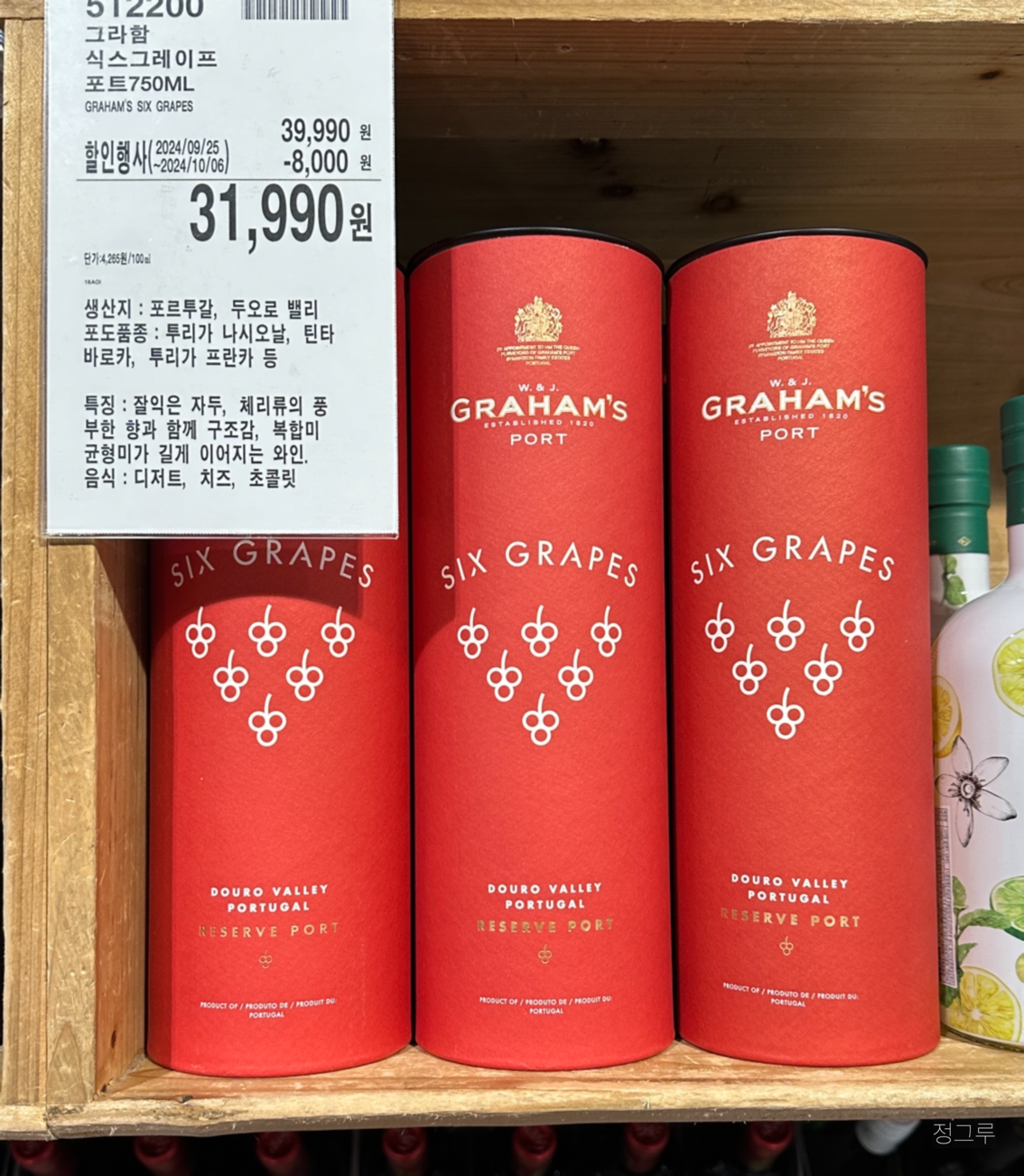 와인 라벨을 훑다 익숙한 포도 여섯 개가 그려진 와인통을 발견했다. 어 이거… 내가 포르투갈에서 사 온 것 맞는 것 같지? 심지어 할인행사 중이지?