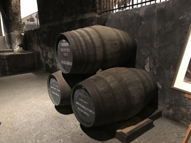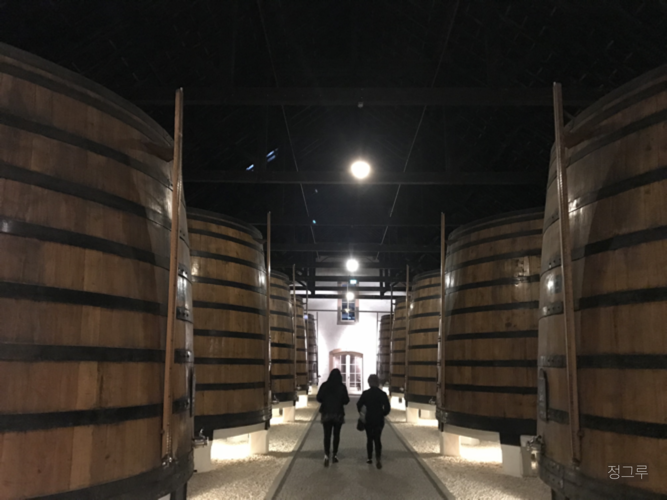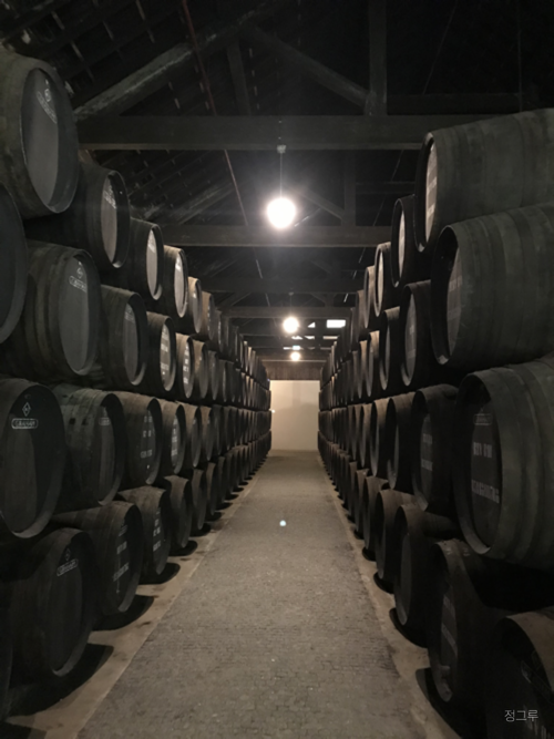 와이너리는 조금 어두웠고 크고 작은 나무통들이 가득했다. 일단 영상으로 와이너리의 역사와 특징을 구경하였다. 포트와인은 포르투갈의 도우루 밸리라는 좋은 동네에서 직접 생산한 포도를 가져와서 발로 눌러 주스를 만들고(웩! 물론 지금은 아니다), 도수가 높은 술(브랜디)을 부어 숙성했다. 보통 와인은 과일이 발효되면서 자연적으로 알코올과 쓰고 신 맛들이 생기는 데 반해 포트 와인은 달달한 과즙에 도수가 높은 술을 부어 발효가 일어나지 않으니 포도의 달달함은 그대로 남아있고 그 과일맛에 브랜디의 맛이 어우러지게 된다. 도수 높은 술 때문에 발효는 일어나지 않지만 어떤 오크통에 얼마나 숙성시켰냐에 따라 맛과 풍미와 색깔에 차이가 커진다고.