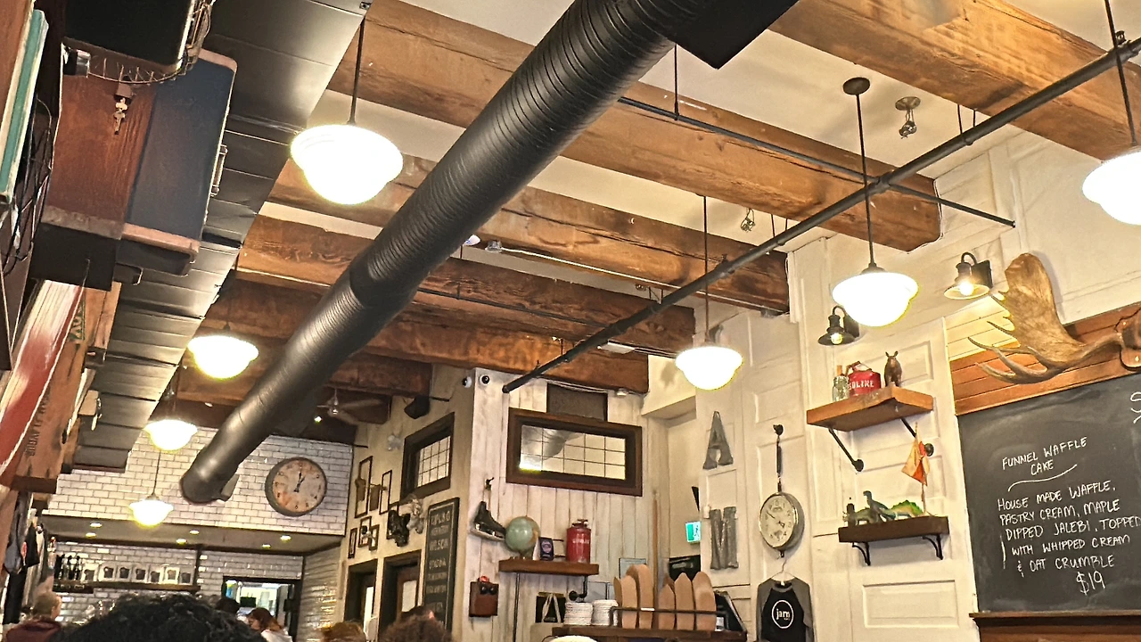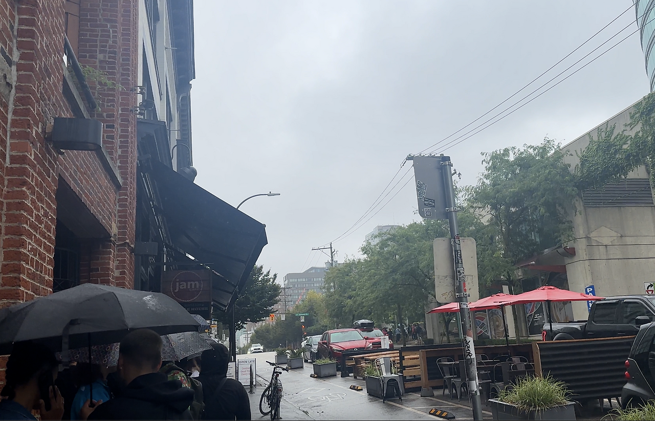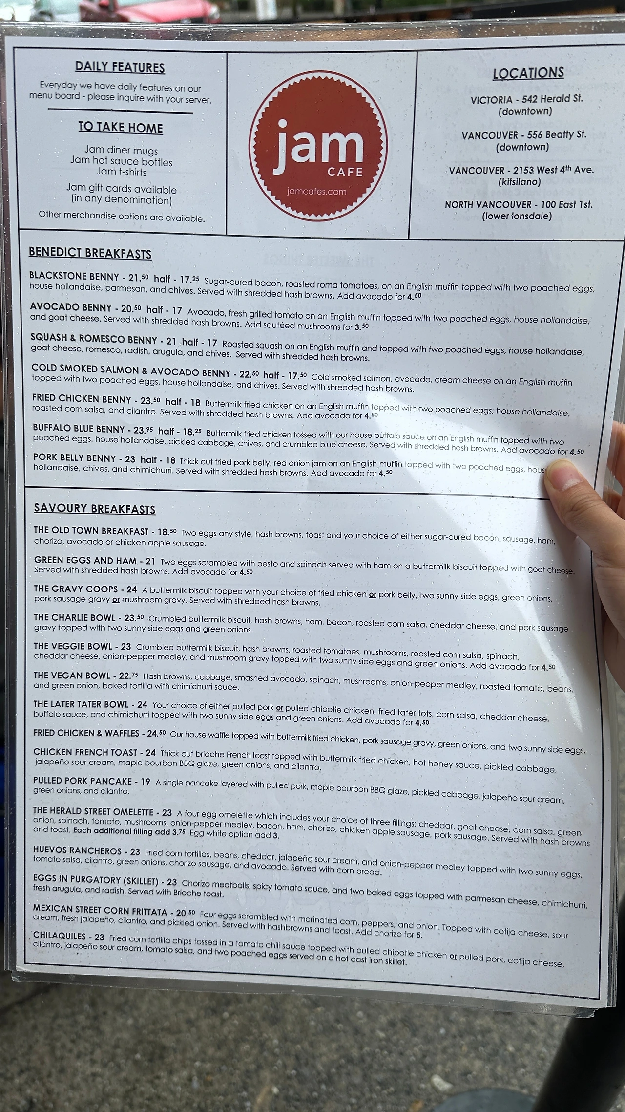 밴쿠버에서 만난 첫 비였다. 추적추적 내리는 비를 맞으며 이미 꽤 긴 줄 뒤에 섰다. 밴쿠버의 대표 브런치 가게인 “잼 카페(Jam Cafe)”였다. 가게 옆으로 길게 늘어선 줄. 줄 선 사람들은 가족 단위가 많았고 커플들도 있었다. 비 내리는 날 오래 서서 기다리고 있으니 지치고 짜증 날 만도 한데 다들 개의치 않으며 ‘칠링’하면서 기다리는 모습이 인상적이었다. 앞에 한 세 팀 정도가 남을 정도에 미리 메뉴판을 받았다.