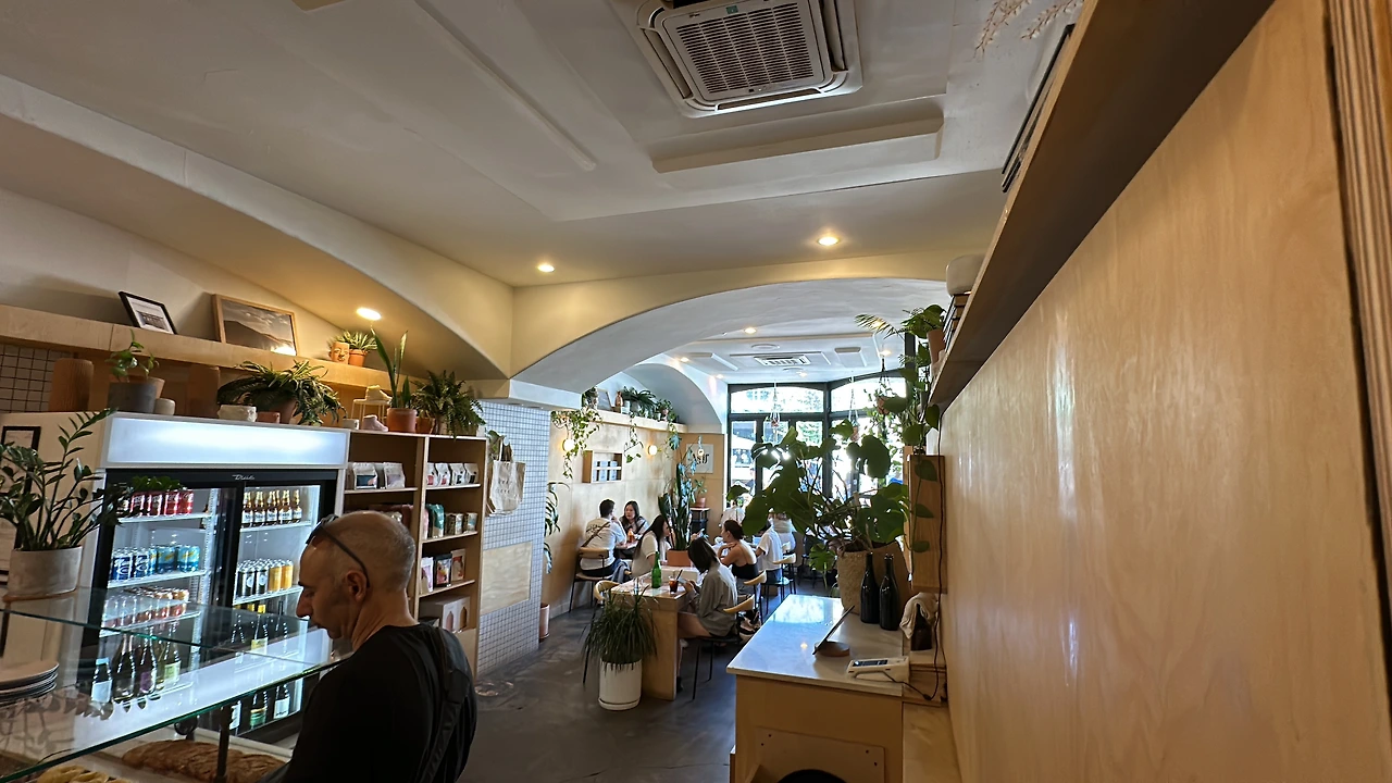 다섯 명이 넉넉히 앉을 수 있는 입구에서 가장 가까운 자리에 배정됐다. 밝고 상냥한 점원이 와서 활기차게 주문을 받았다. 잘 되는 가게는 가게의 분위기와 맛있는 음식, 그리고 그와 잘 어우러지는 멋진 직원, 이 삼박자가 맞는 가게가 많다고 생각한다. 손님으로 가득한 카페는 아주 넓진 않았지만 아늑하고 편안한 느낌을 줬다. 나무 탁자에서는 약간의 세월의 냄새가 났다. 나는 기본 메뉴만 시키고 음료도 안 시켰는데 그는 오렌지 주스에다가 이것저것 추가 메뉴를 왕창 시키는 것을 보며 샘이 났다. 이따 좀 빼앗아 먹기로 다짐했다.