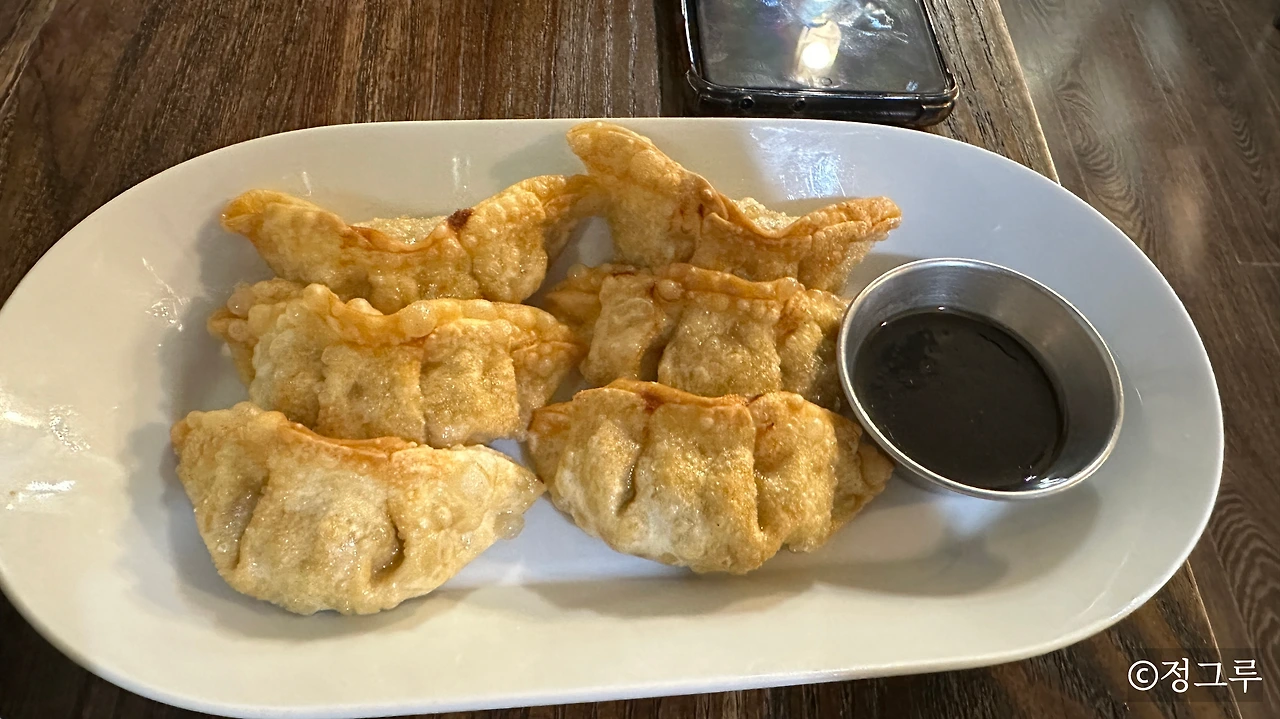 교자 한 입, 엄청나게 뜨거운 겉은 바삭바삭, 한 입 물면 파삭하고 두툼한 피 사이에 들어있던 육즙 가득한 소가 함께 가득 내 입으로. 바삭촉촉.