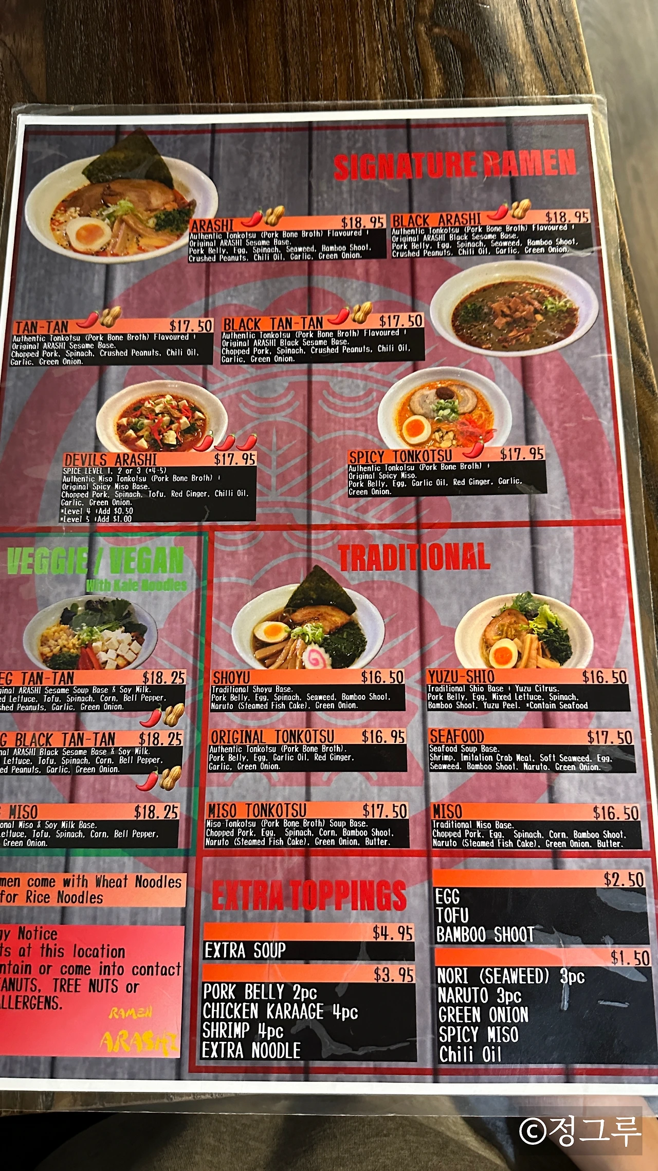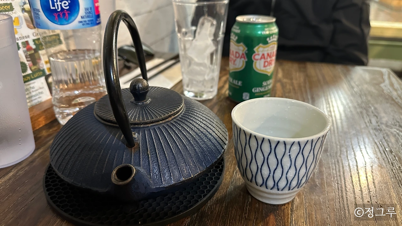 메뉴판을 보고 혼란스러워 할 필요 없다. 이미 후기를 읽으면서 무엇을 주문할지 다 정해놨기 때문이다. 평소 익숙한 돈코츠(돼지뼈육수) 베이스의 아라시 라멘으로 가자. "프리미엄 일본 녹차" 와 교자도 같이 주문했다.