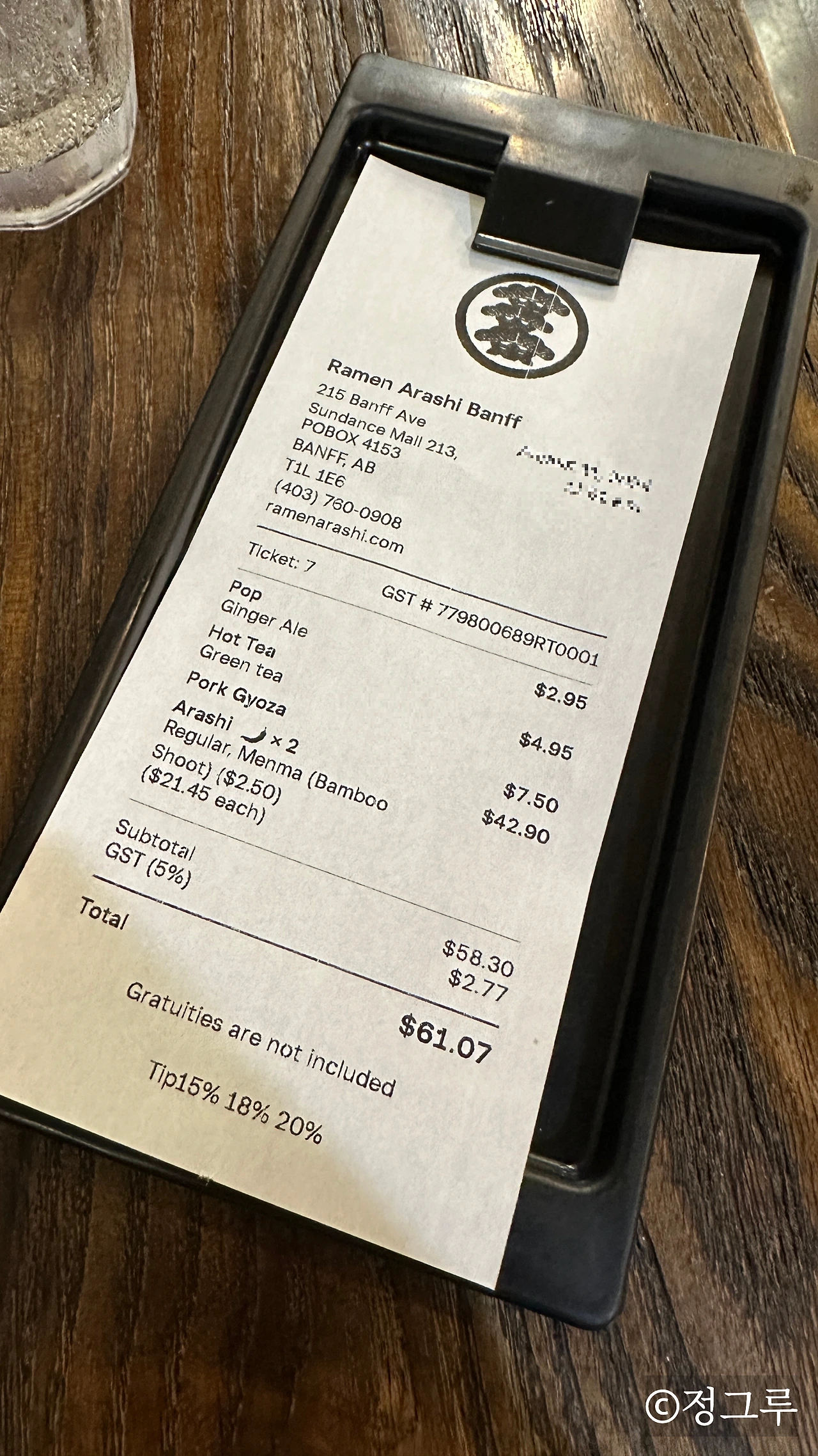 그렇다. 한 끼 라멘 두 그릇과 교자, 녹차를 주문하고 육만 원. 어쩐지 사무치게 그립고 맛있더라니. 아흑. 물가 비싼 캐나다 중에서도 인기 많은 여행지인 밴프에서 맛있는 일본 라멘을 먹으려면 이 정도는 각오해야겠지. 어흑 어흑. 그런데 어라? 우리 죽순 추가한 적 없는데, 죽순을 추가해 버렸네. 오천 원 더 나왔네.