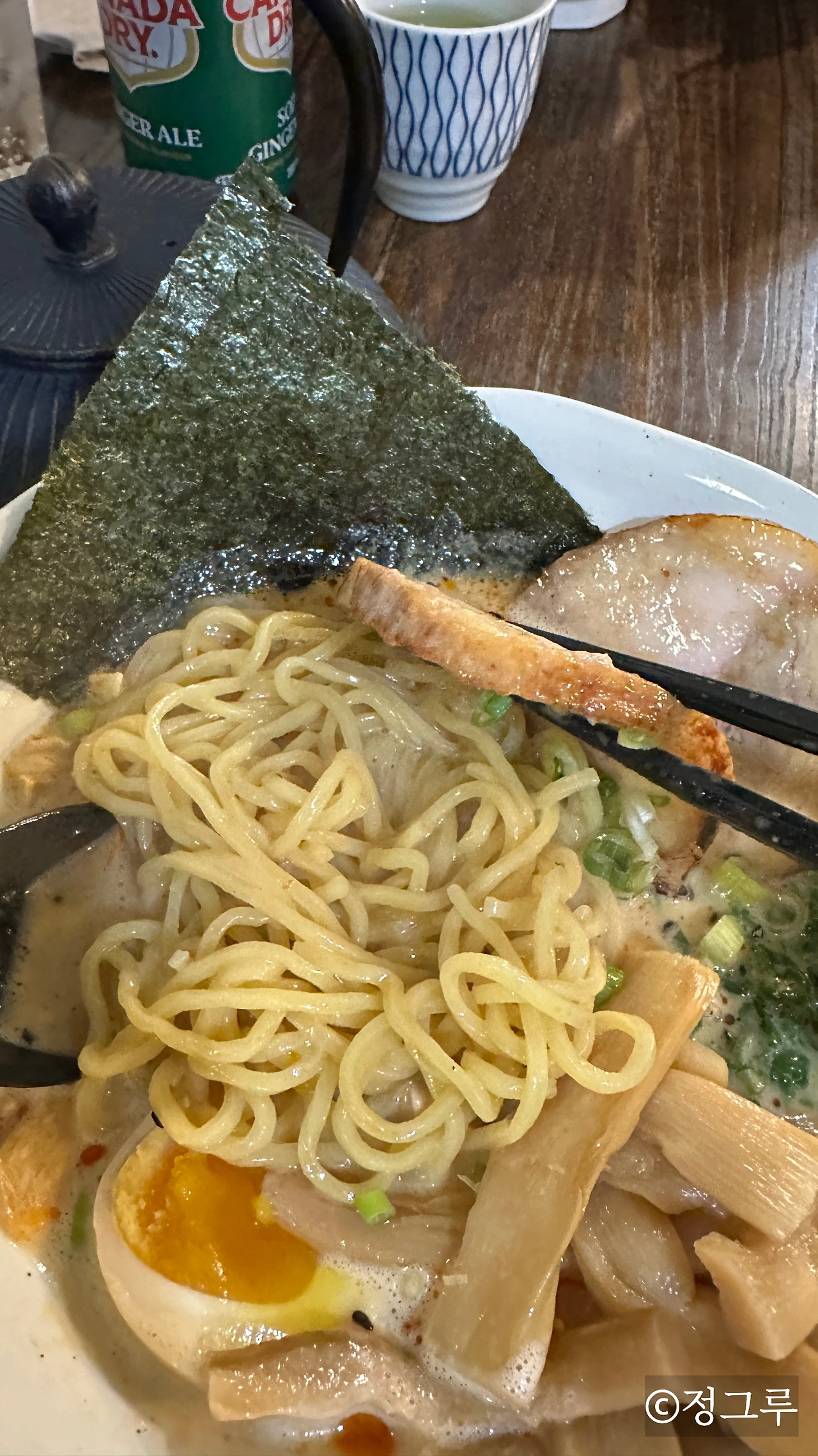 살짝 당황했지만 한 번 더 먹어봤다. 그제야 국물이 “땅콩 돈코츠”라고 말하기 시작했다. 아, 이 맛이다. 내가 그리워하던 이 구수하고 뜨끈한 맛. 특유의 바다내음마저 사랑스러운 김도 한 입에 넣어 녹여 먹고, 탄탄한 면을 듬뿍 먹는다. 아, 맛있다. 오길 잘했다. 보들하고 큼직하며 두툼하기까지 한 차슈도 푸짐하게 한 입 베어 분다. 국물과 잘 어울린다. 여기 맛집 맞네!
