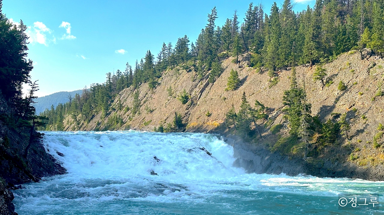 오후 여섯 시도 넘은 시간. 비록 아직 날은 밝지만 해가 쨍쨍하지는 않았다. 때문에 강물이 햇빛을 반사하며 영롱하게 빛나진 않았지만(다른 분들이 찍은 사진을 보면 이 강의 물빛도 매우 아름다웠다), 시원하고 예쁜 색깔의 강이 폭발적으로 움직이는 모습이 시원함과 해방감을 주었다. 왼쪽을 보면 작은 폭포가 세차게 흐르고 있는데, 규모는 크지 않아도 거칠고 세찬 그 모습에 속이 또 한 번 시원해졌다.