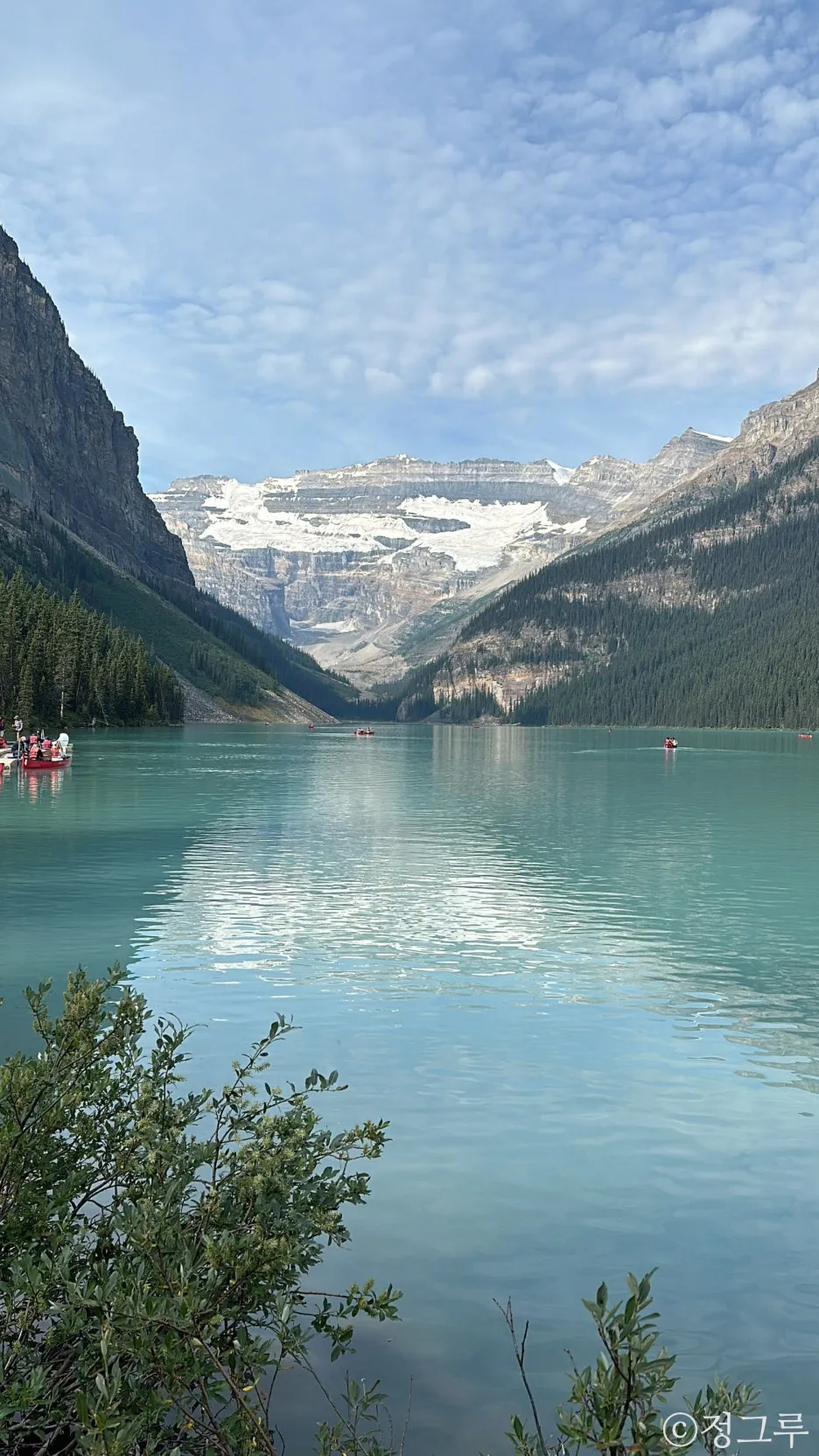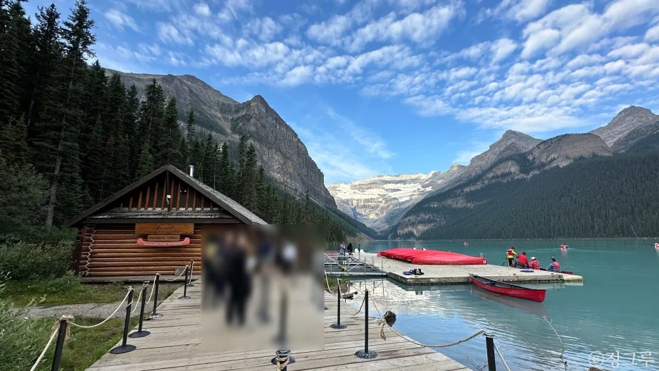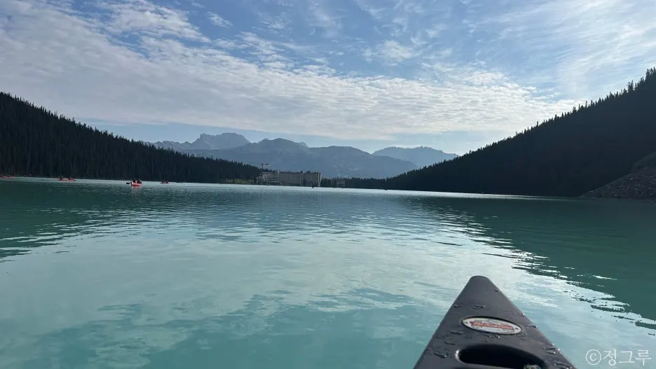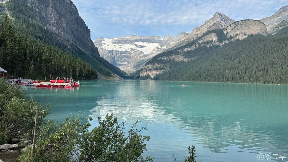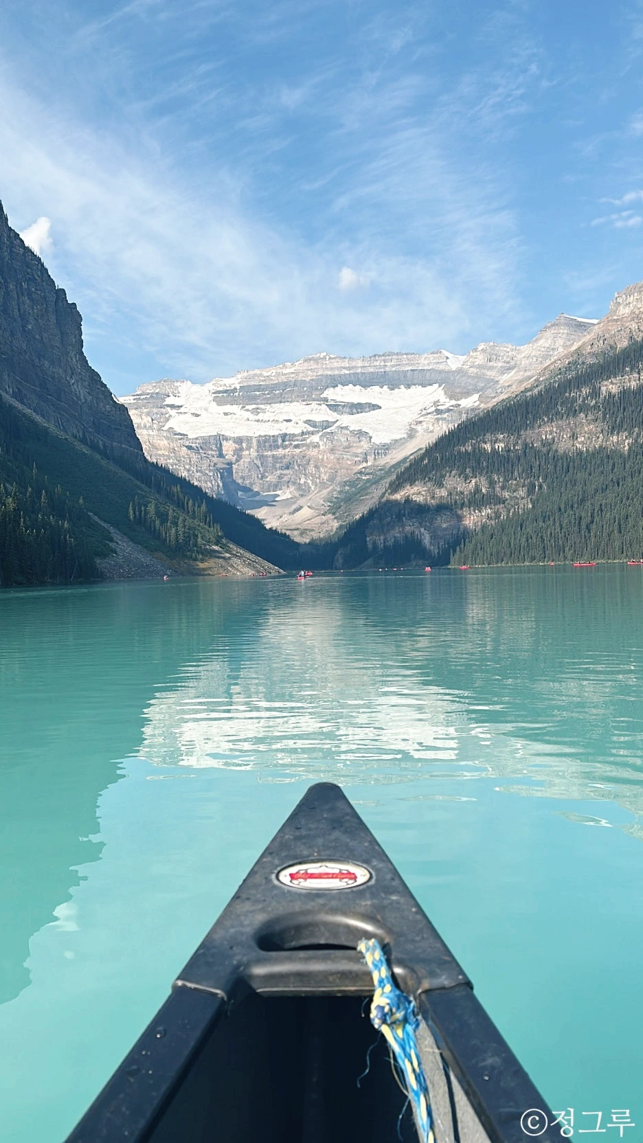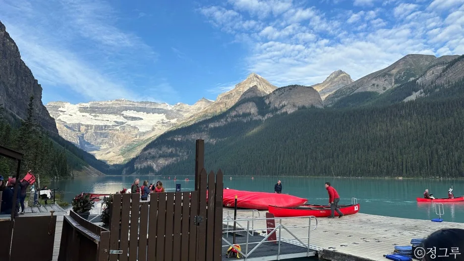 내가 알고 상상하던 빛깔이 아닌 호수에서 카누를 타서 조금 아쉬운 마음을 간직한 채 직원분과 스몰 톡을 해 보니 오후가 사람이 더 많은 건 맞다고, 하지만 직원분은 차분하고 아름다운 이 아침의 레이크 루이스를 더 좋아한다고 하셨다.