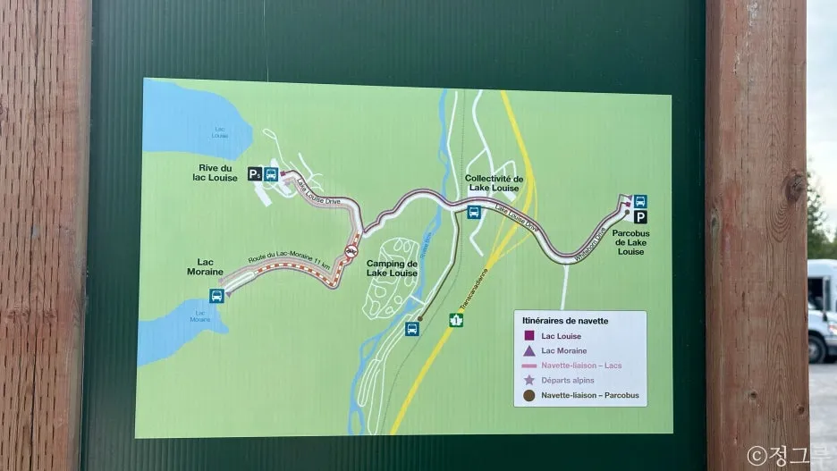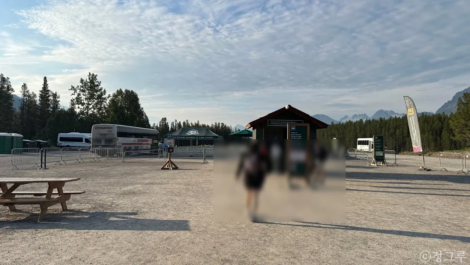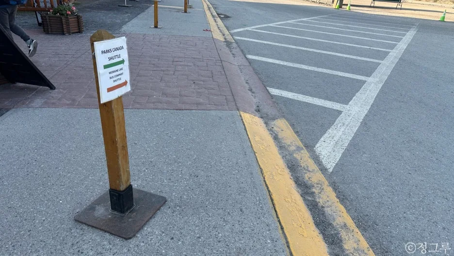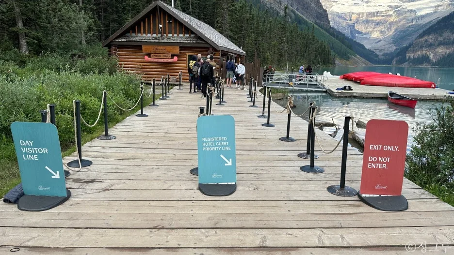 셔틀은 레이크 루이스와 레이크 모레인을 마음대로 왔다 갔다 할 수 있지만, 이곳에서 어느 호수를 먼저 갈 건지는 예약할 때부터 미리 정하고 그에 따라 첫출발을 해야 한다. 나는 내가 뭘 예약한 줄도 몰랐다가 레이크 루이스 쪽으로 가라는 안내를 받았다. 레이크 모레인 쪽에 줄 선 사람이 조금 더 많아서 다행이라 생각했다. (아무 줄이나 가도 된다는 사람도 있지만 어떤 직원은 예약한 대로 첫출발을 하라고 한다니까 그냥 내가 예약한 쪽에서 출발하자.)